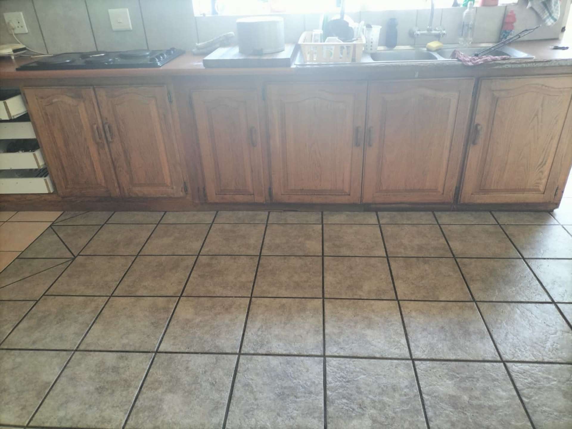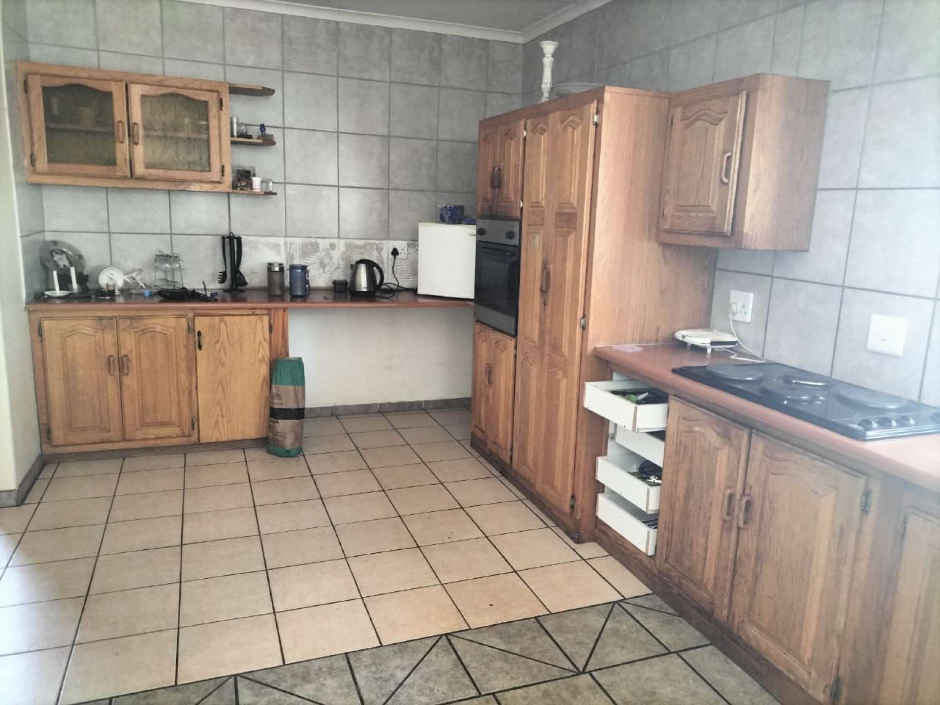 Inside, the home features a spacious open-plan kitchen fitted with built-in cupboards, an electric stove, and an eye-level oven.
