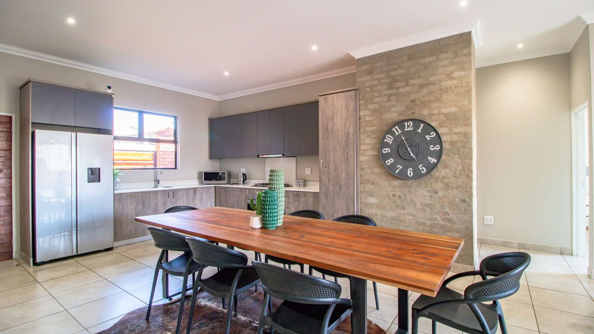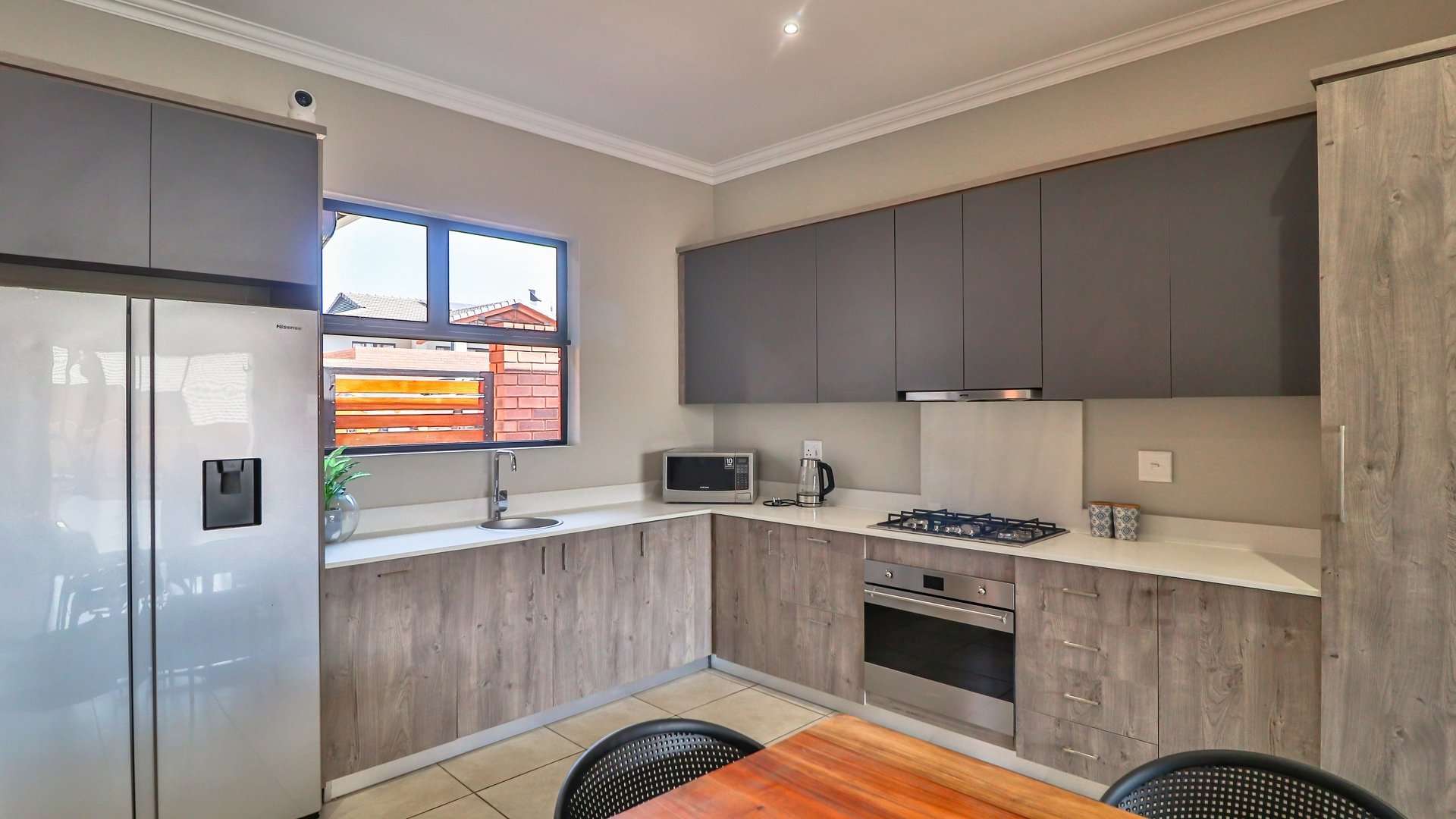 * Open-plan kitchen with ample cupboards, granite countertops, pantry, Smeg gas hob, electric oven, and space for all appliances