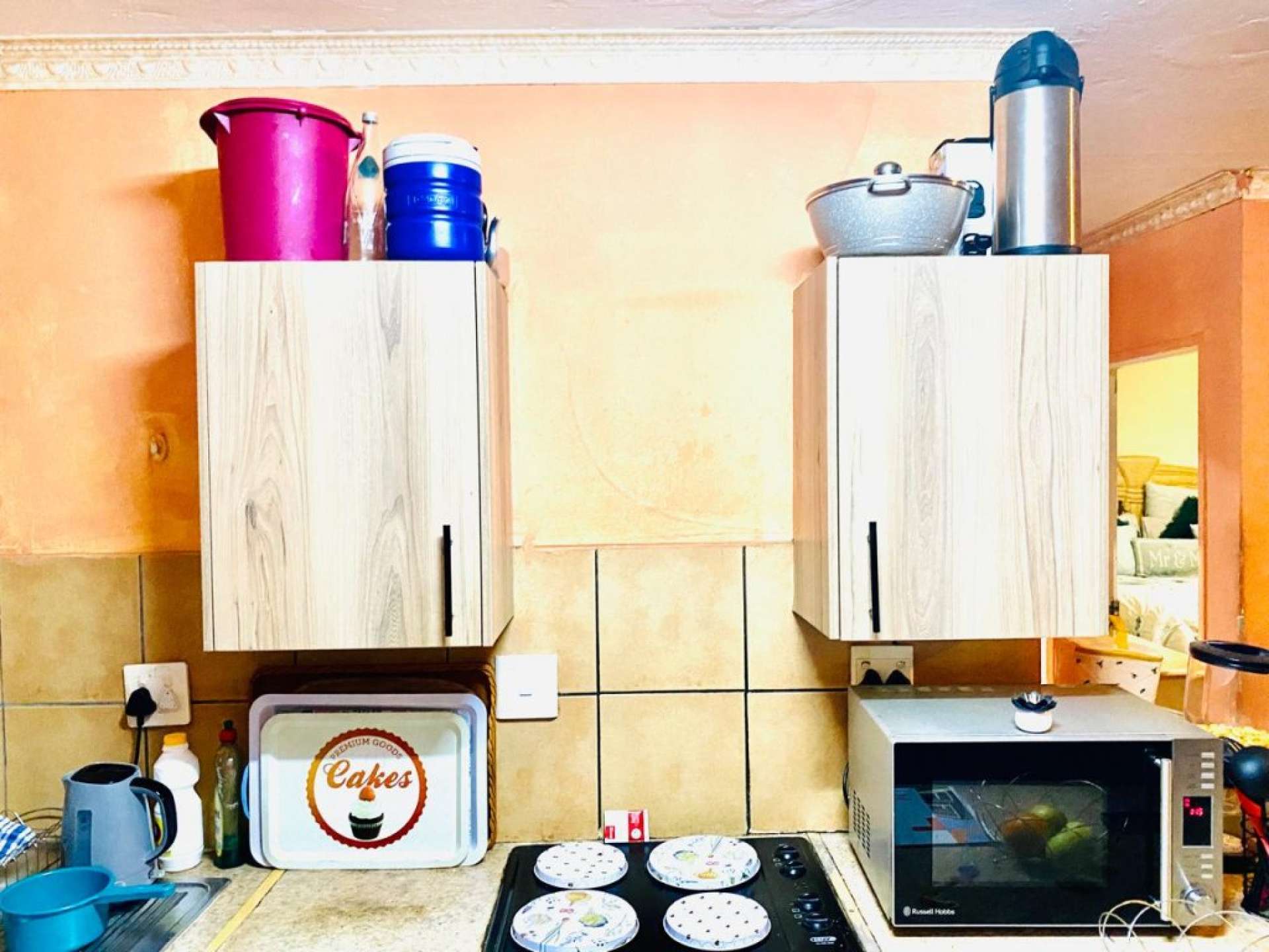 - Neat Kitchen with fitted cupboards and space for your stove and fridge
