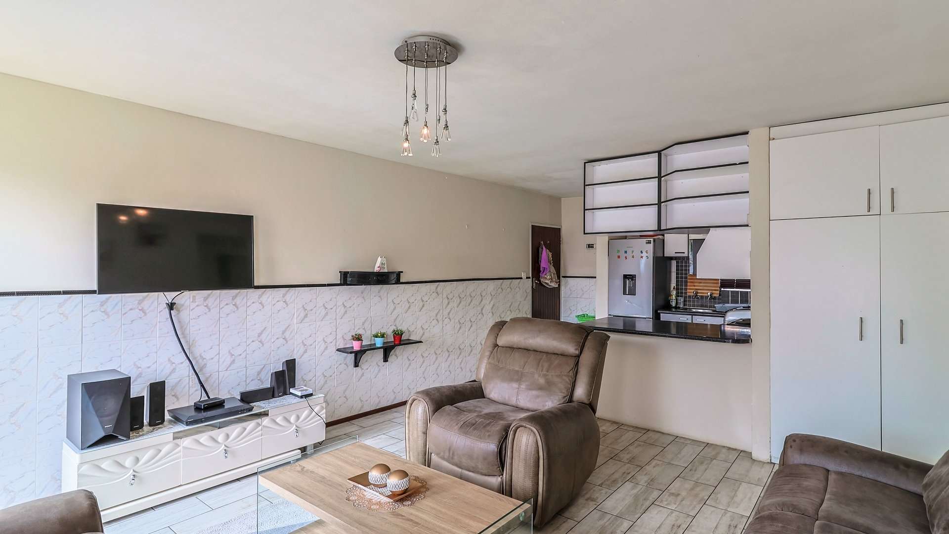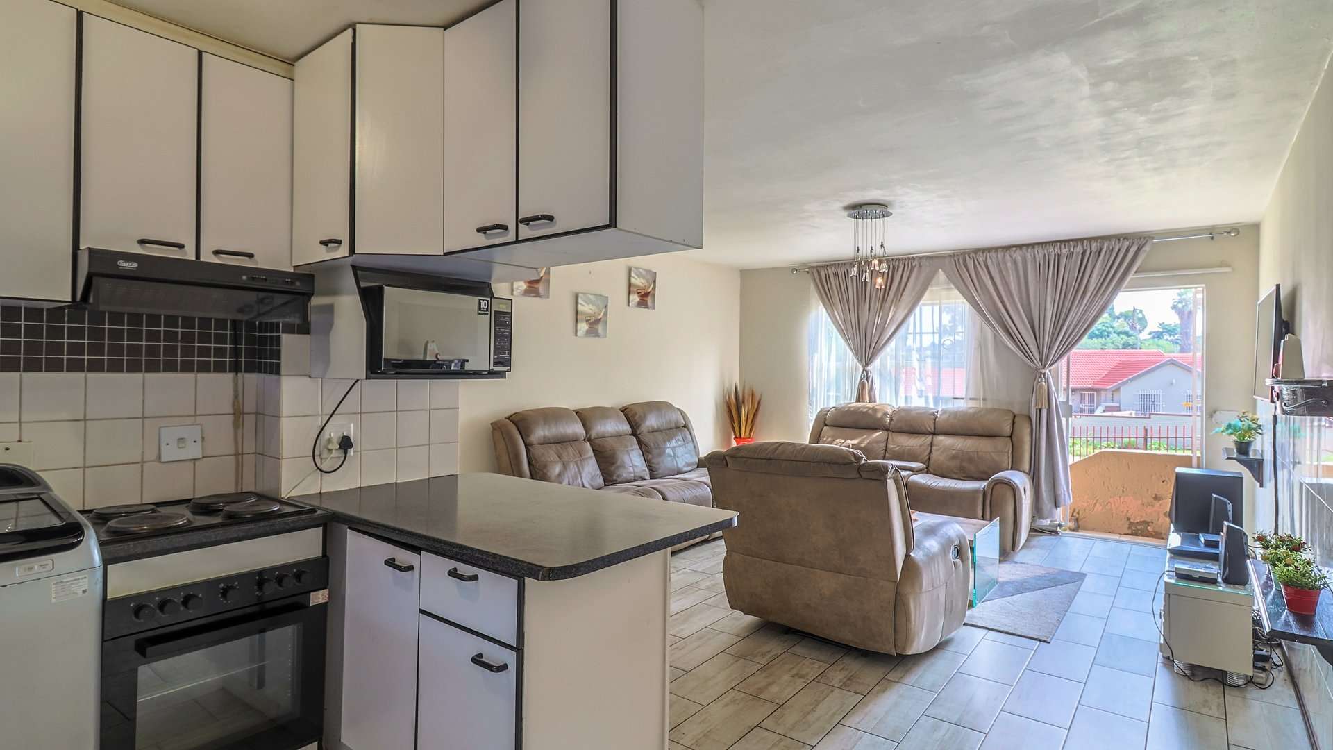 The open-plan living and dining area seamlessly flows into the well-equipped kitchen, creating a perfect space for relaxation and entertaining.
