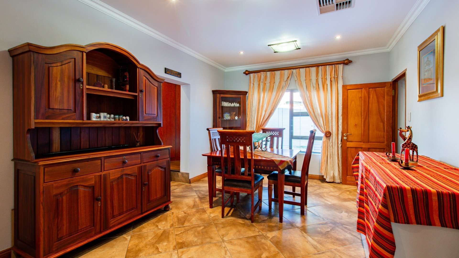 The dining area, located upstairs, provides the perfect setting for hosting intimate dinners or family gatherings.