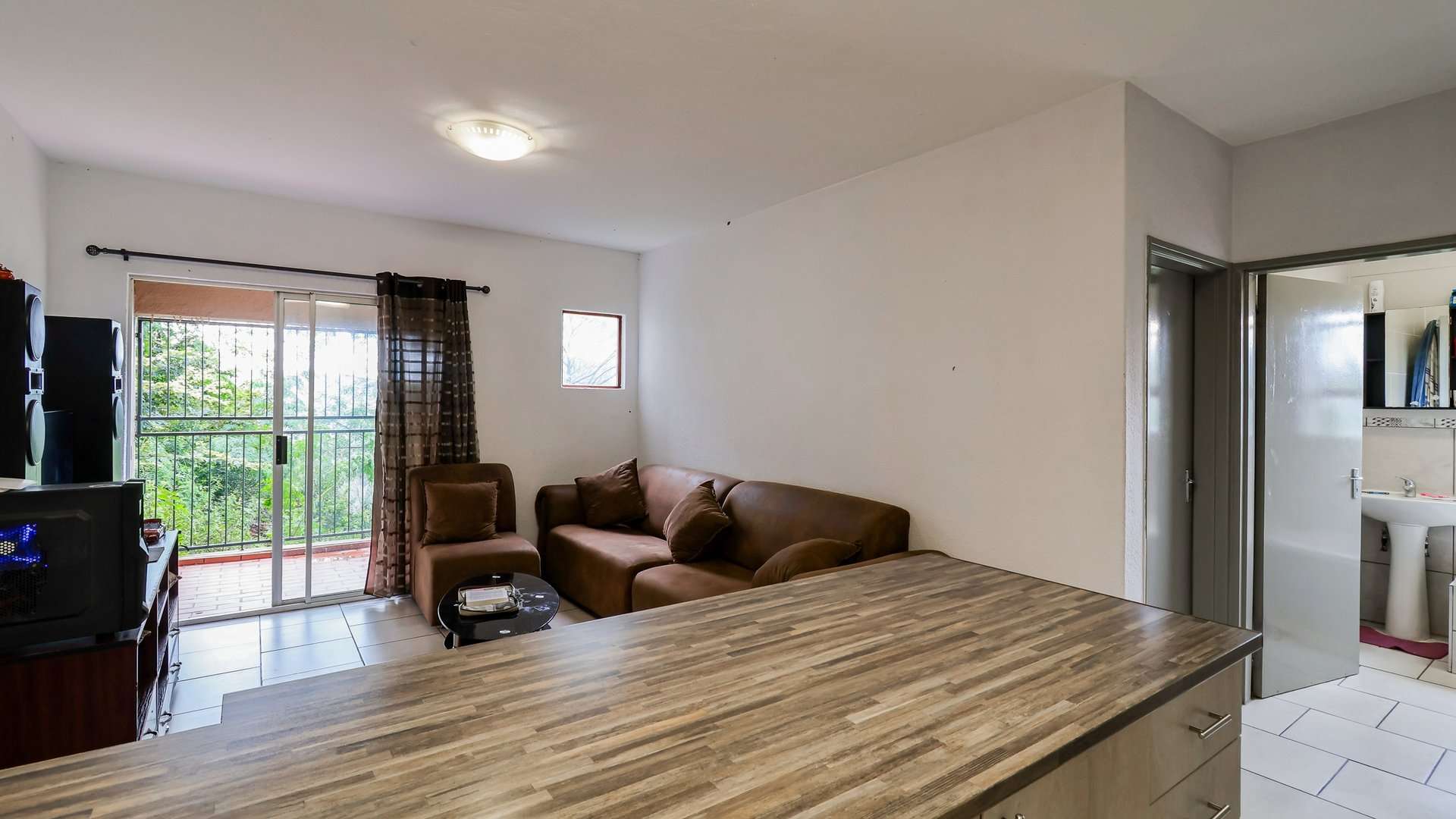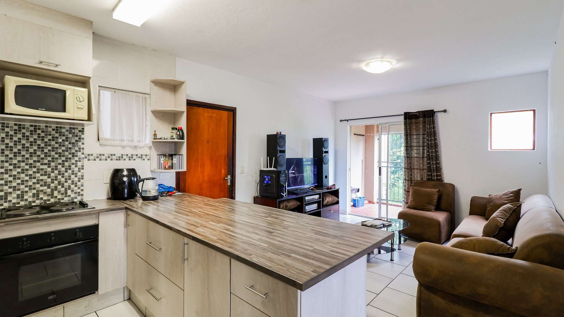 Open-plan lounge and kitchen flowing onto the balcony