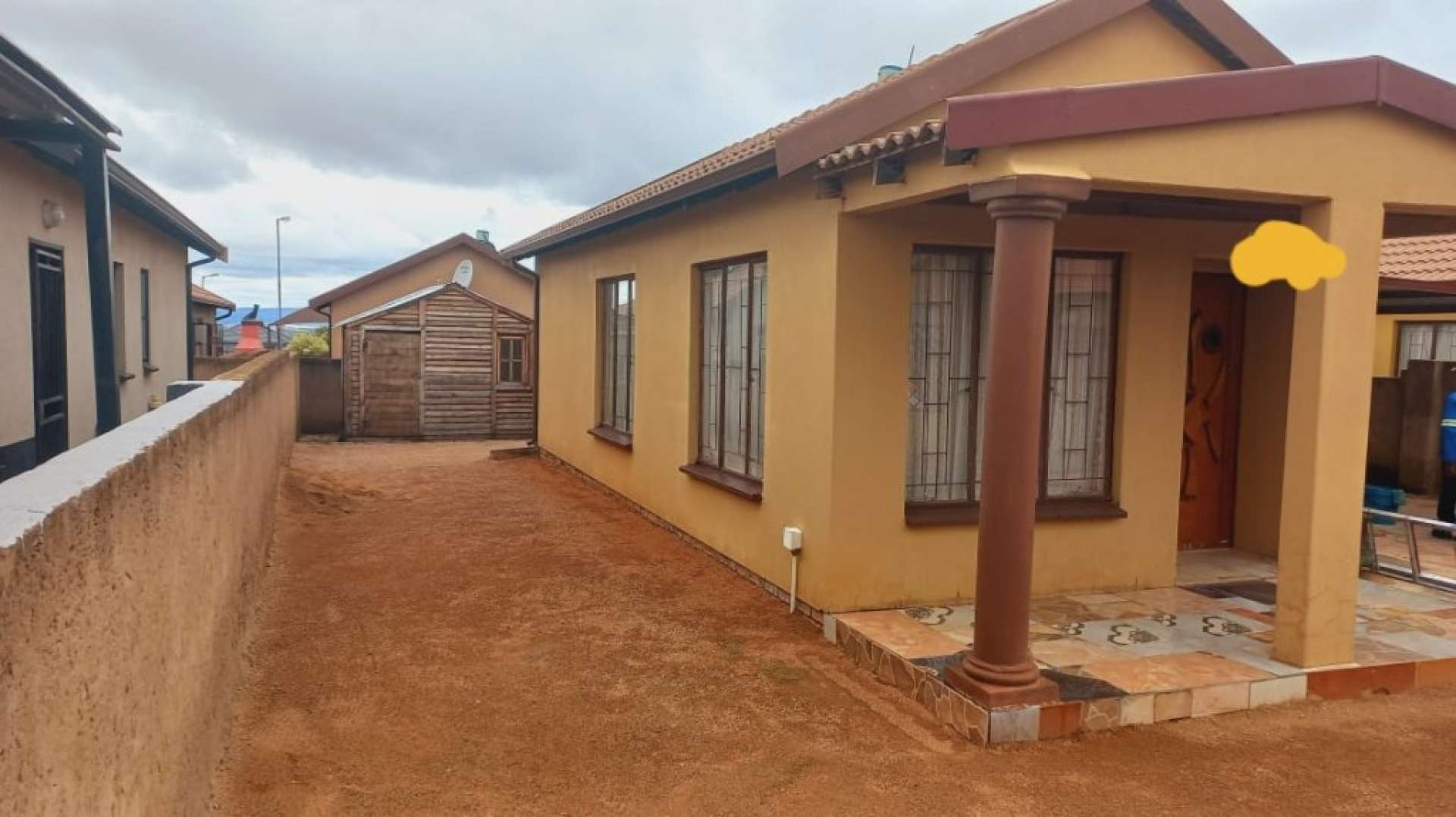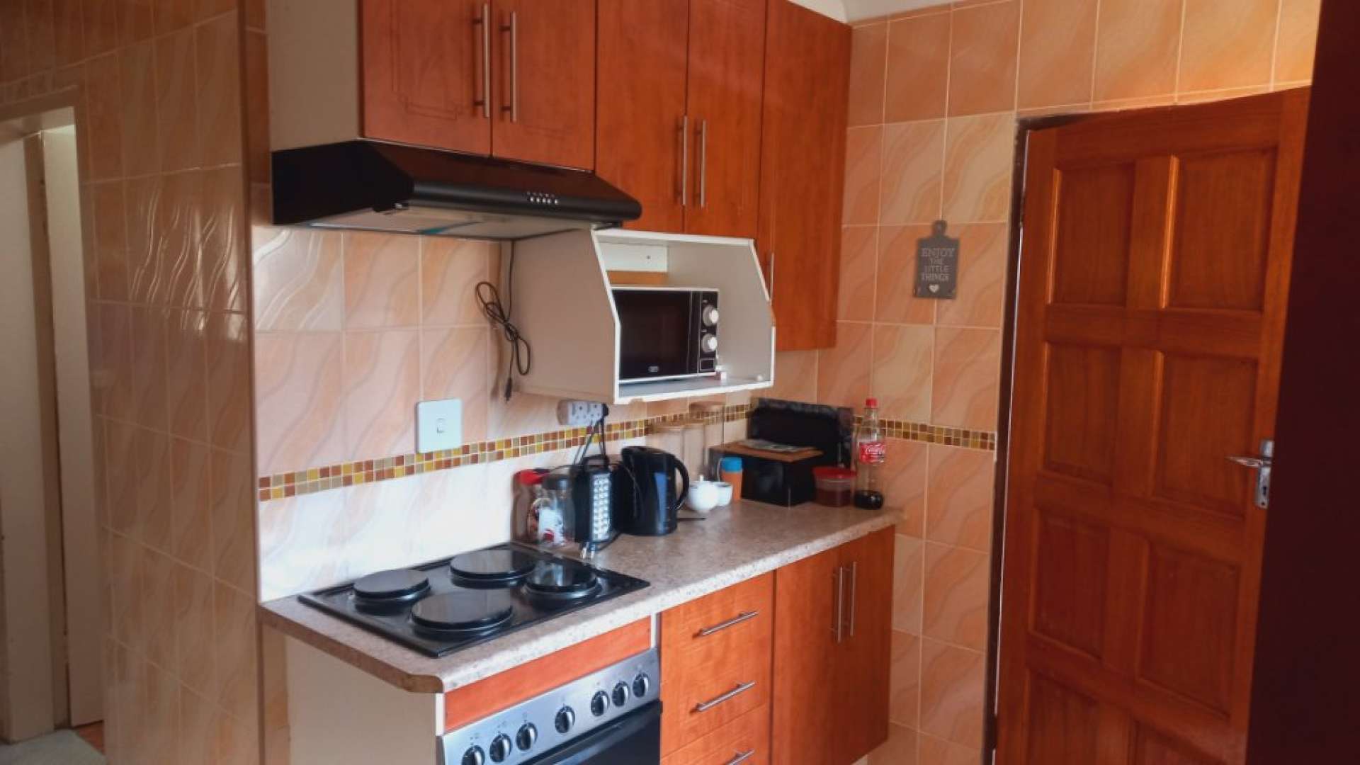 This property boasts a spacious yard with a Zozo hut included. It features a living area and a modern kitchen equipped with built-in cabinets.