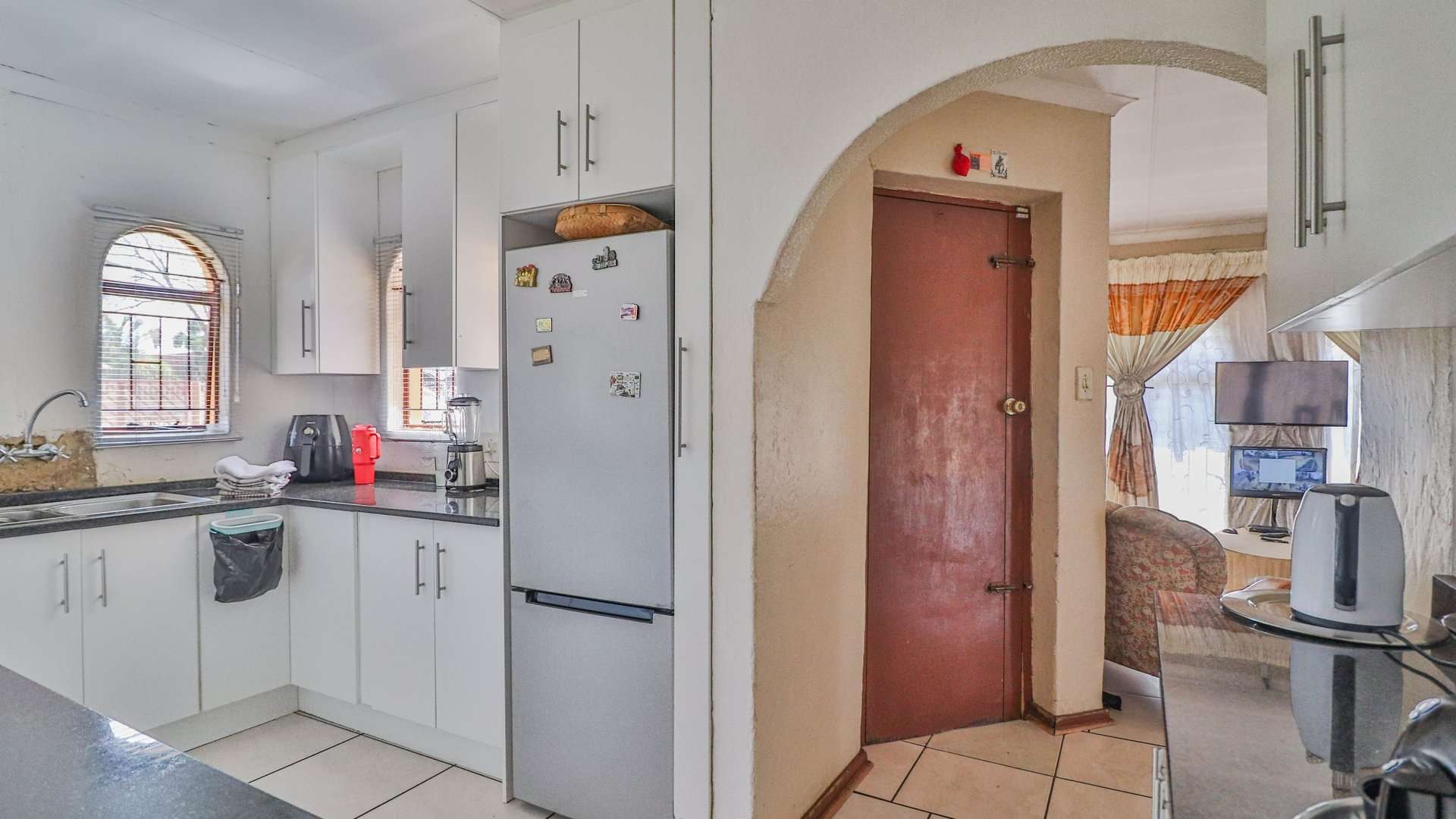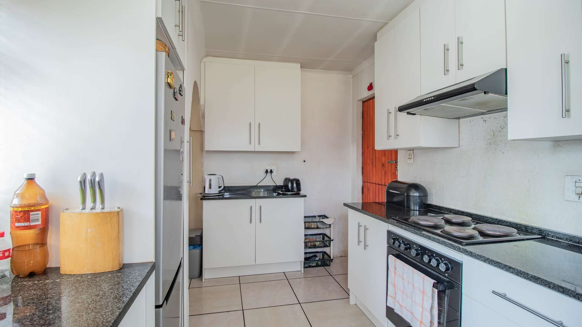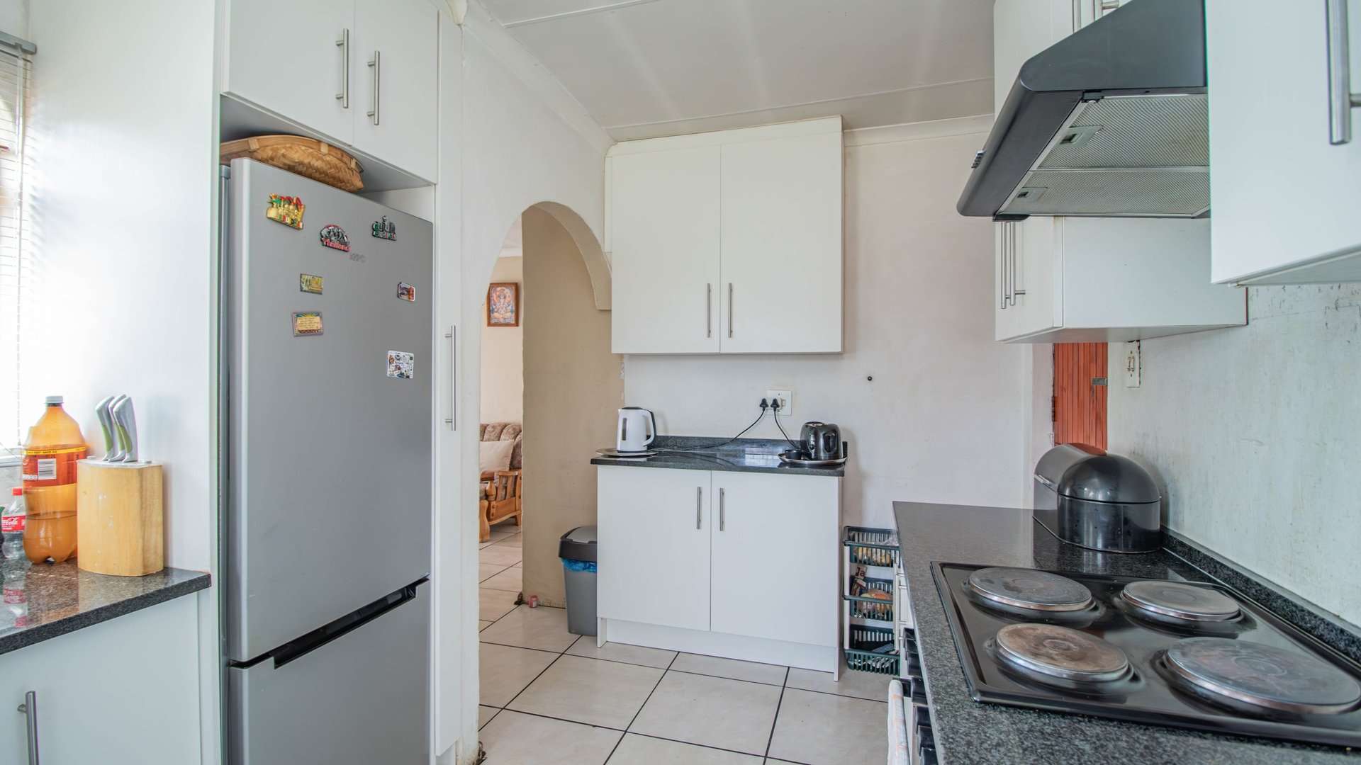 The open-plan lounge and dining room flow into a neat kitchen fitted with built-in cupboards and an electric stove, creating the perfect heart of the home.