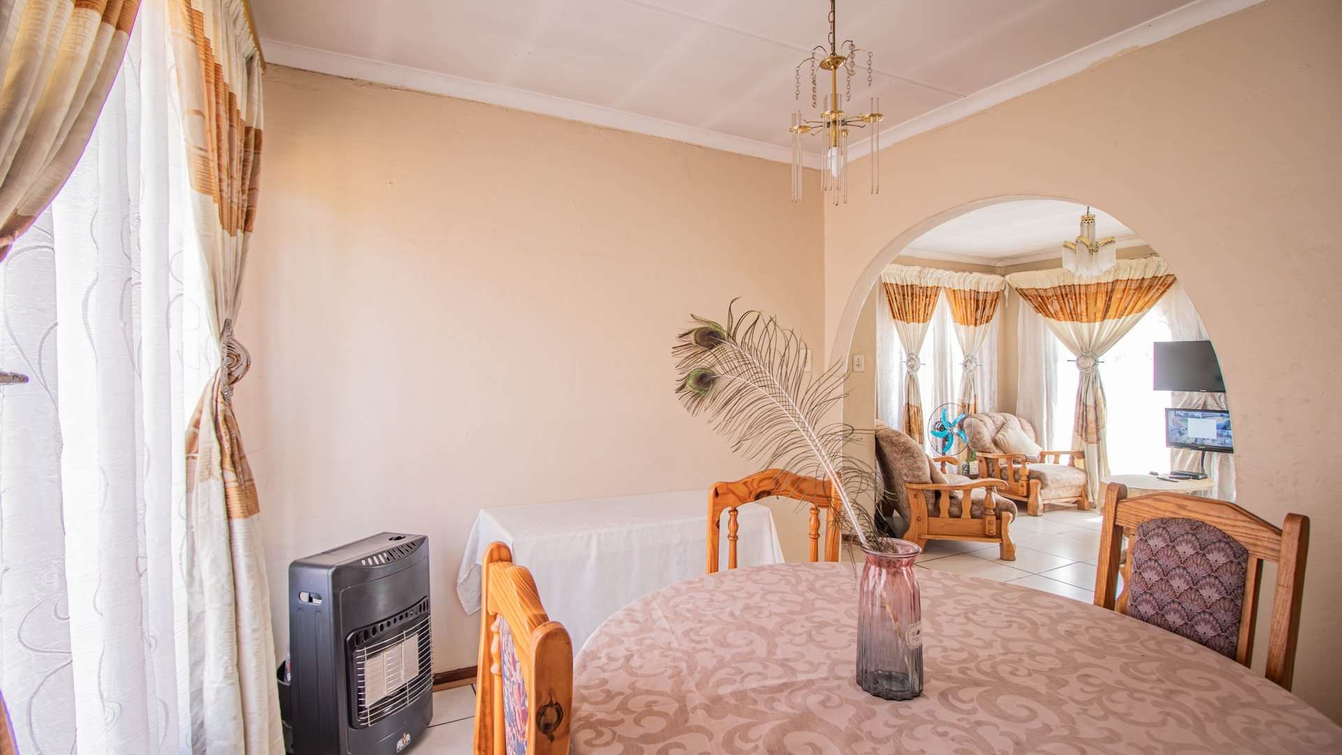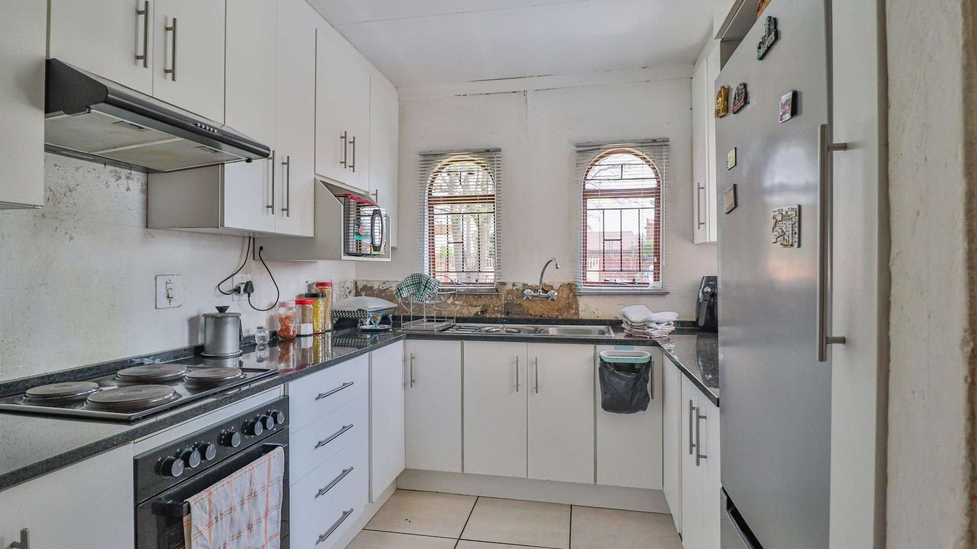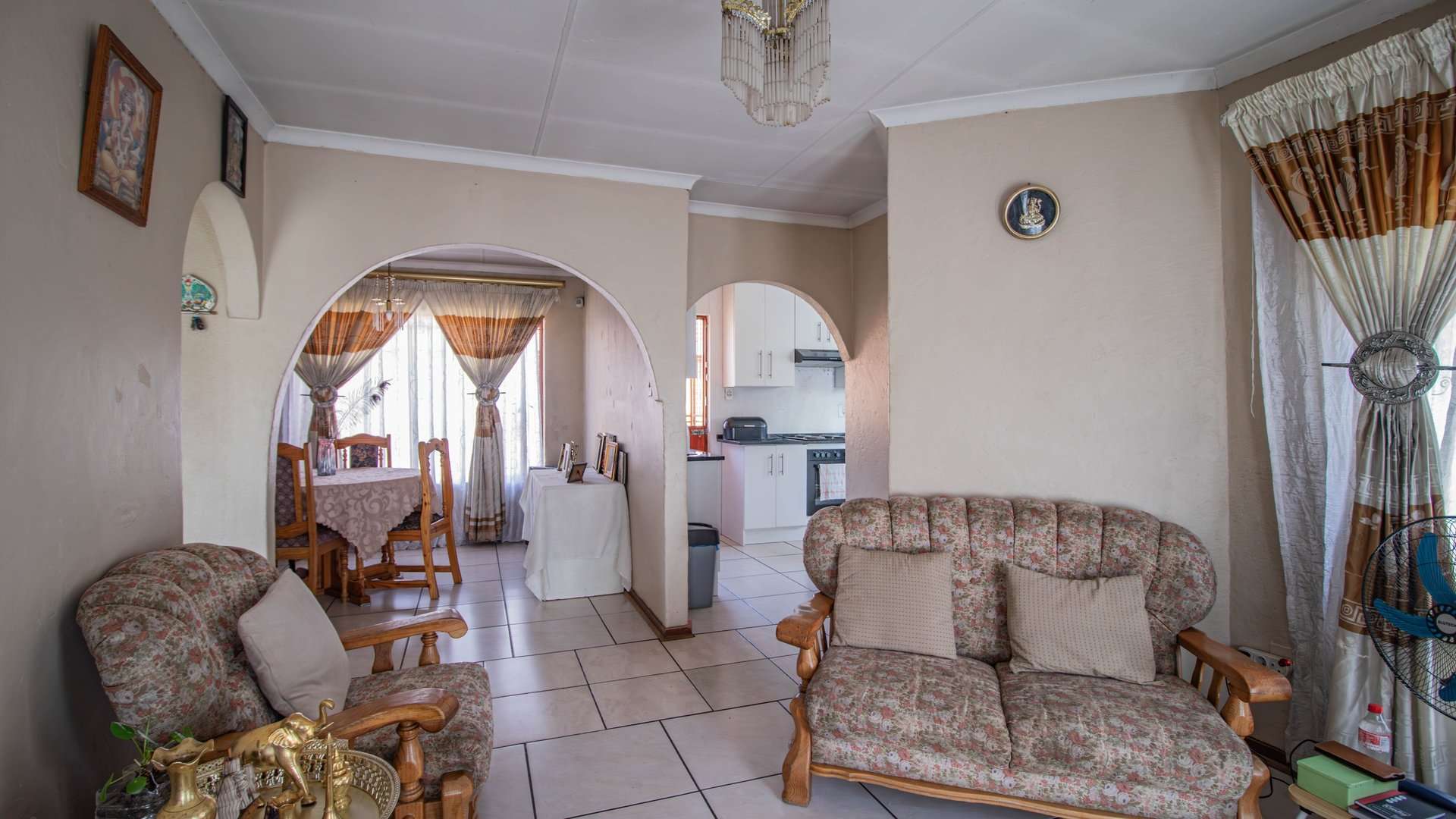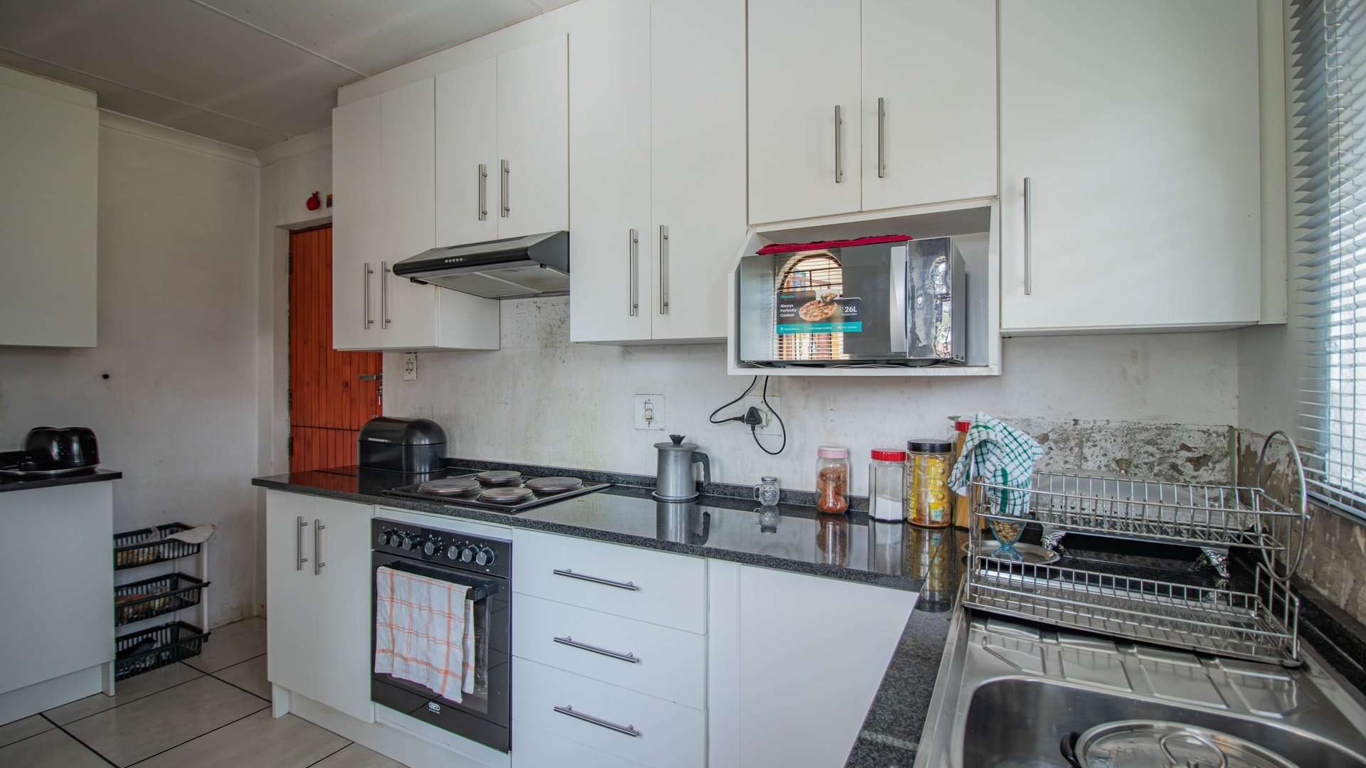 The open-plan lounge and dining room flow into a neat kitchen fitted with built-in cupboards and an electric stove, creating the perfect heart of the home.