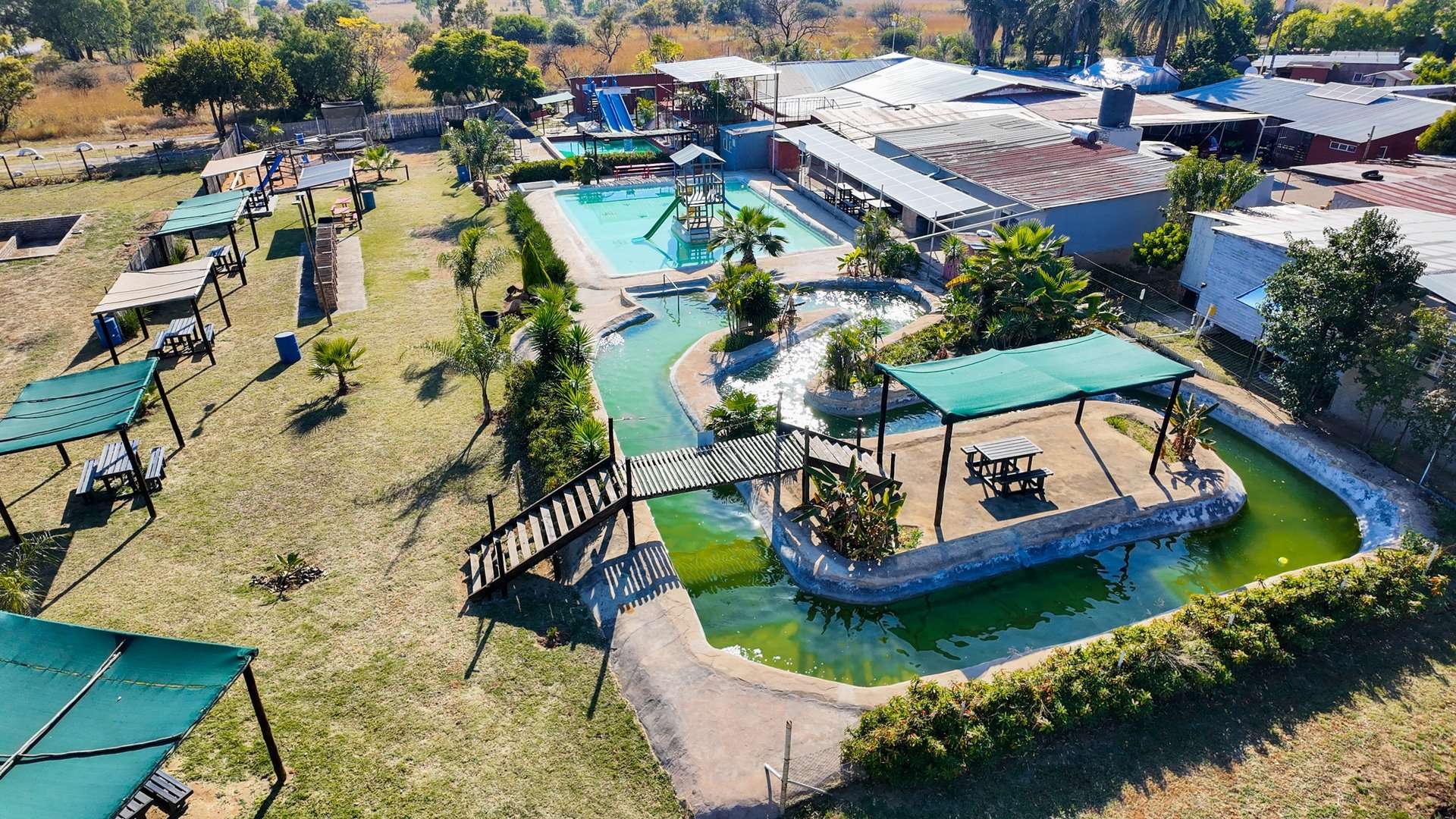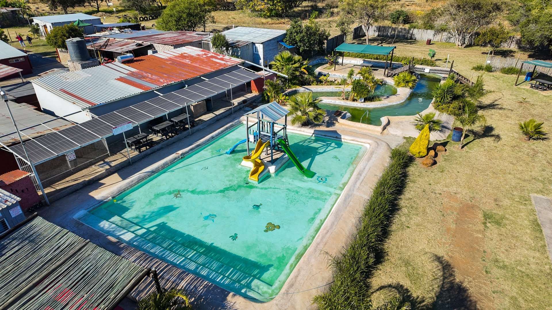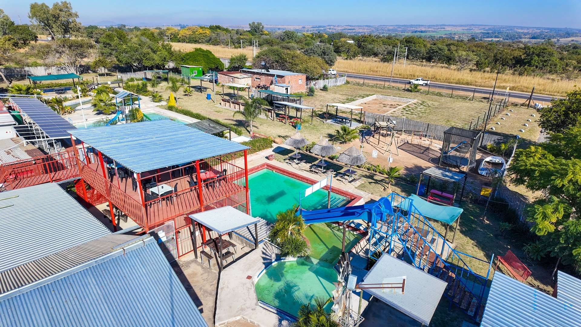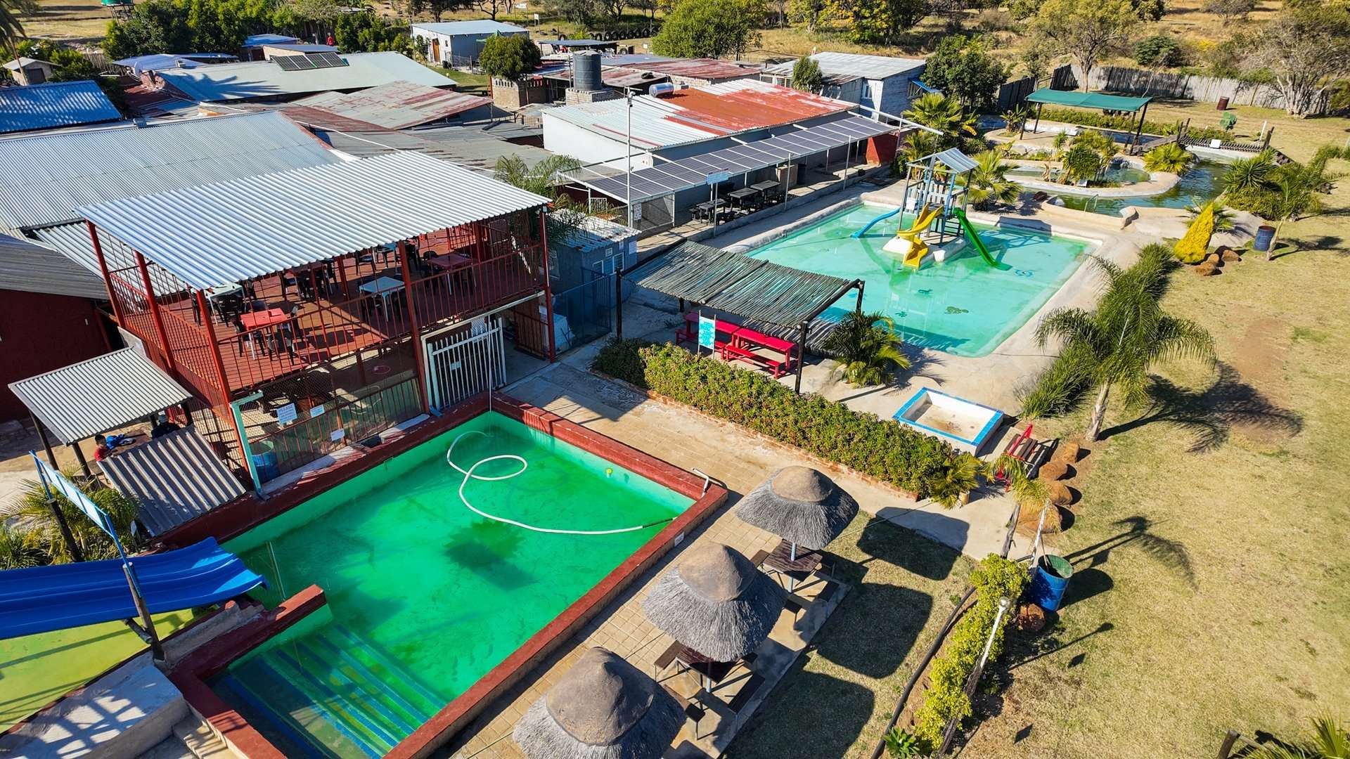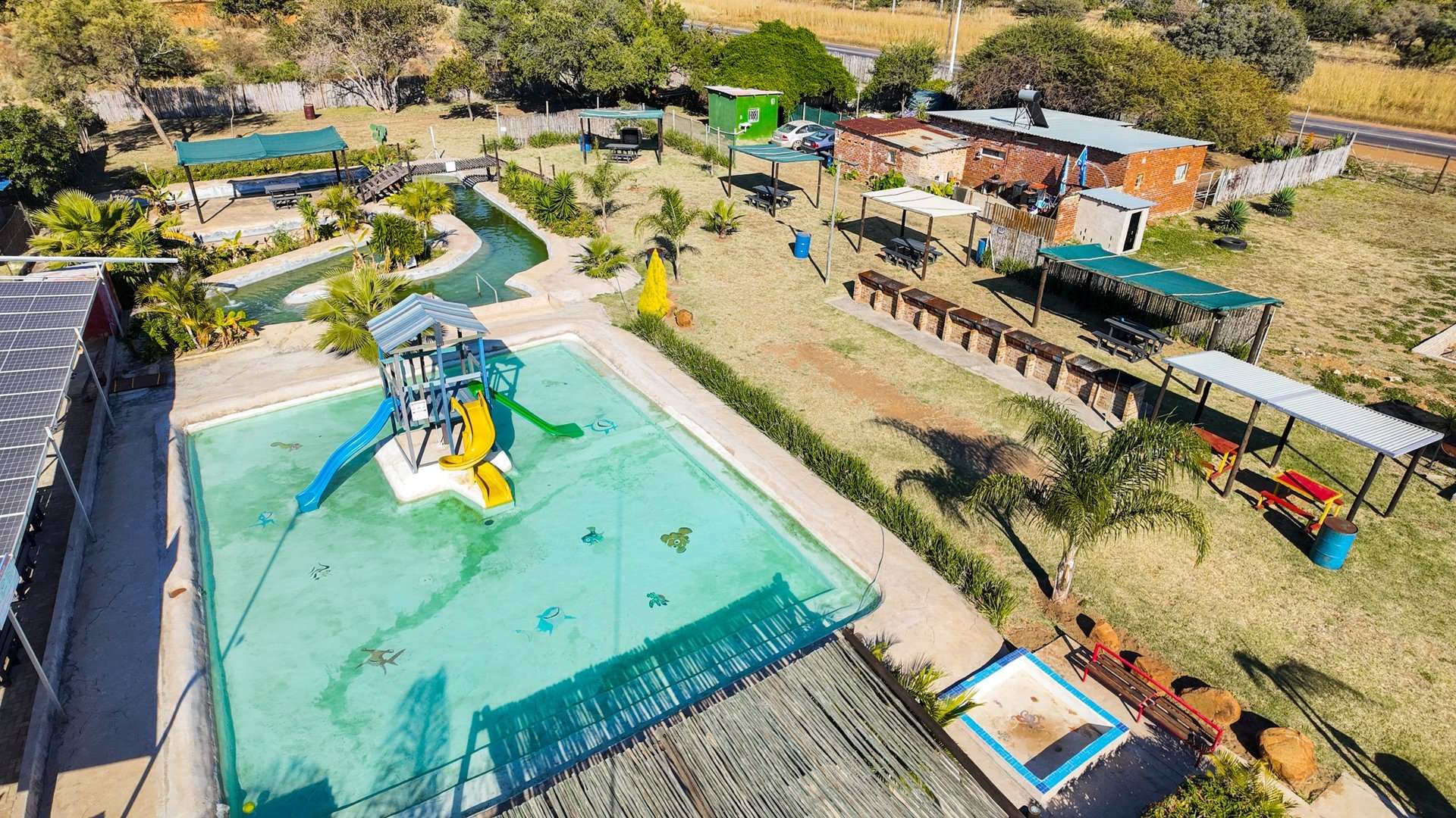 Besides a 4 bedroom and 3-bathroom house this property 10ha is mainly known for the water park entertainment area complete with swimming pools and water slides, a restaurant/pub/casino with the best pub lunches in the area. It also has single rooms as overnight facilities, apartments for additional rental income and a caravan park with permanent residents.