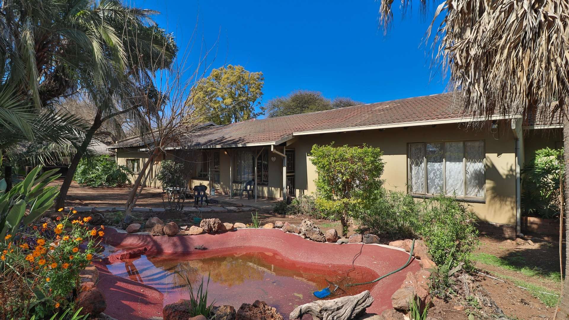 The main house is a spacious residence with 3 bedrooms, 2 bathrooms, modern kitchen with separate scullery and a laundry room, 2 offices that's perfect for working from home but can also be converted to bedrooms, comfortable open plan living and dining areas. The house overlooks a landscaped garden with a sparkling pool and water features.