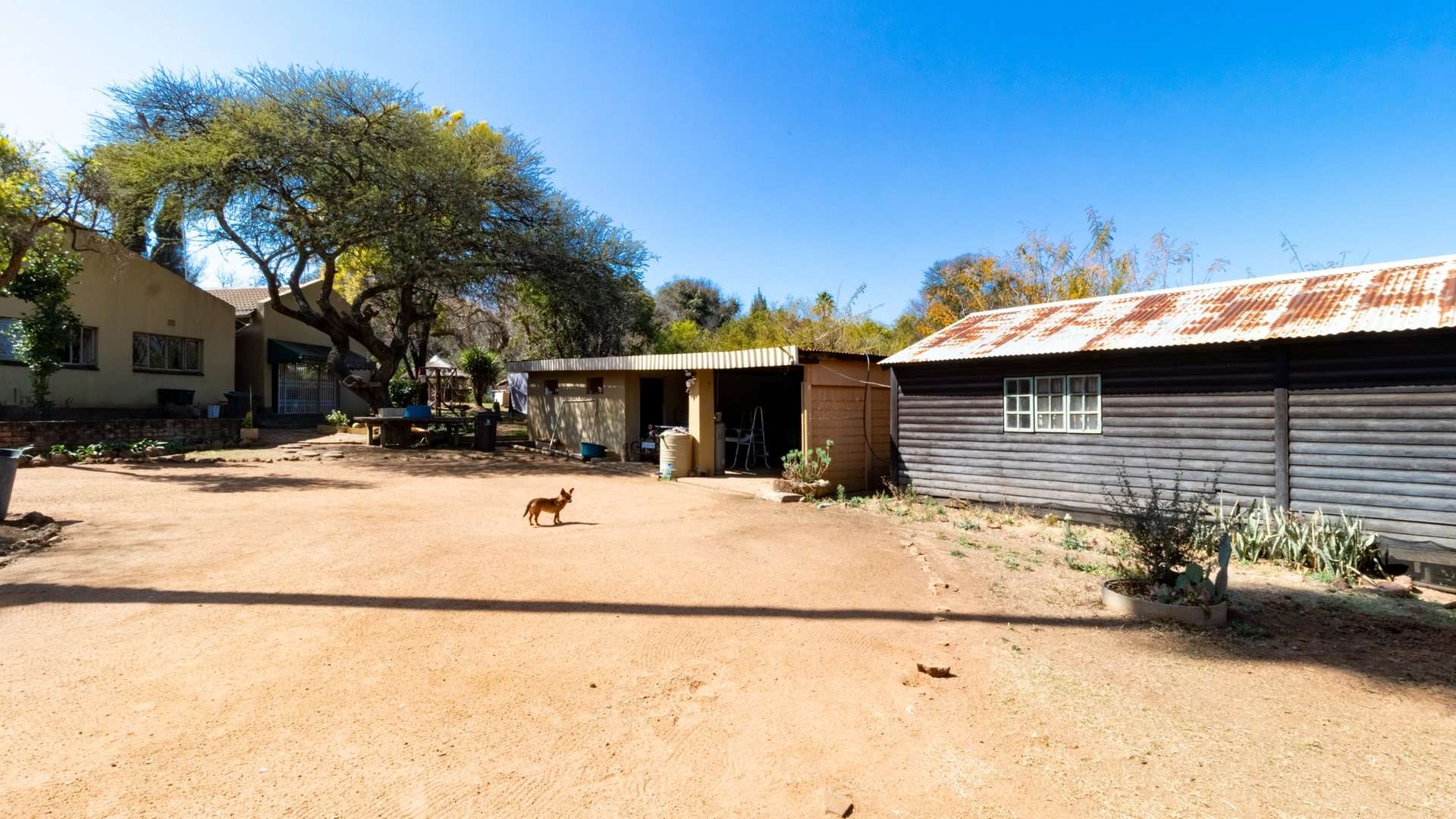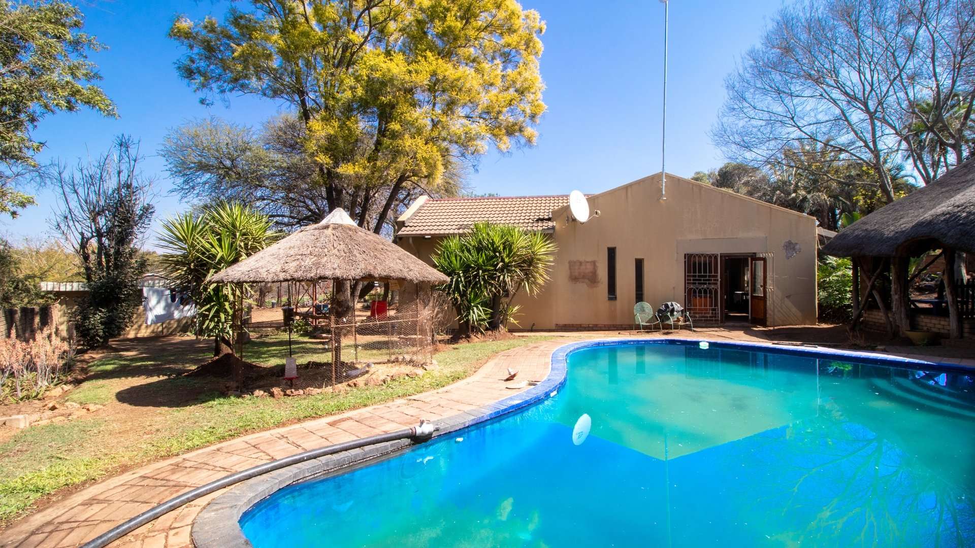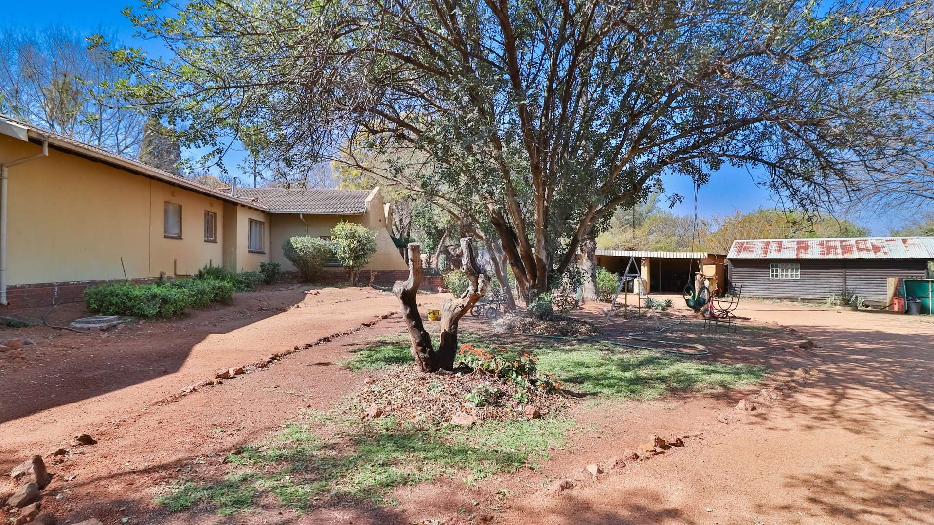 Well established bird house, sheep kraal for livestock, 3 staff rooms, 1 borehole for additional irrigation and another one supplies clean drinking water although 500 liters water is delivered per day by Tshwane for household use.