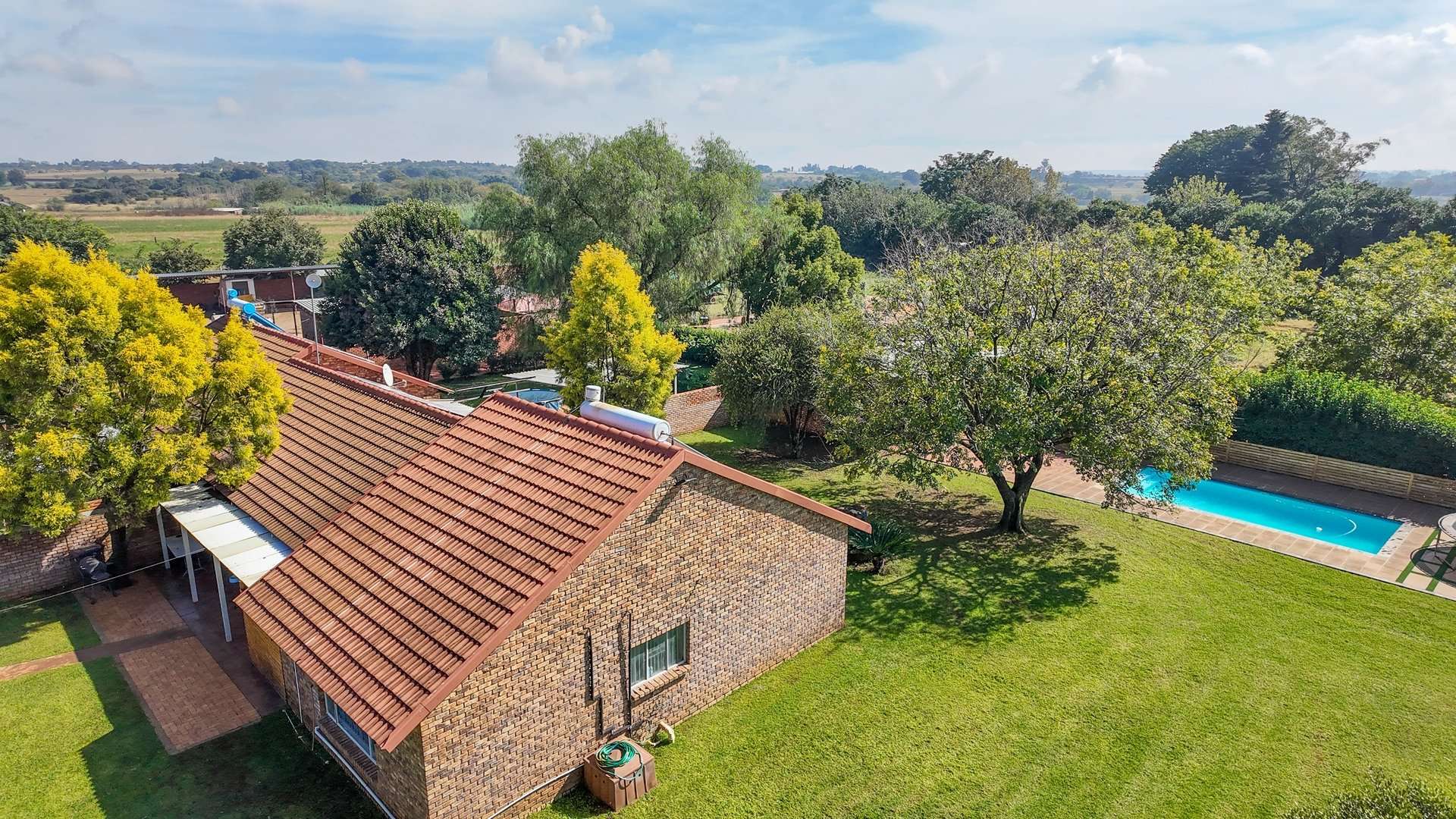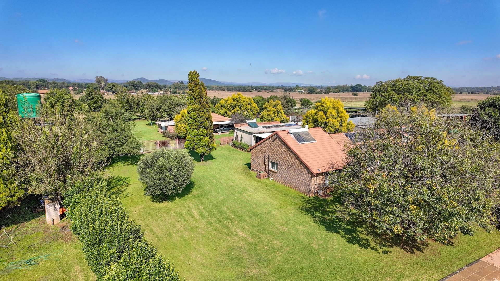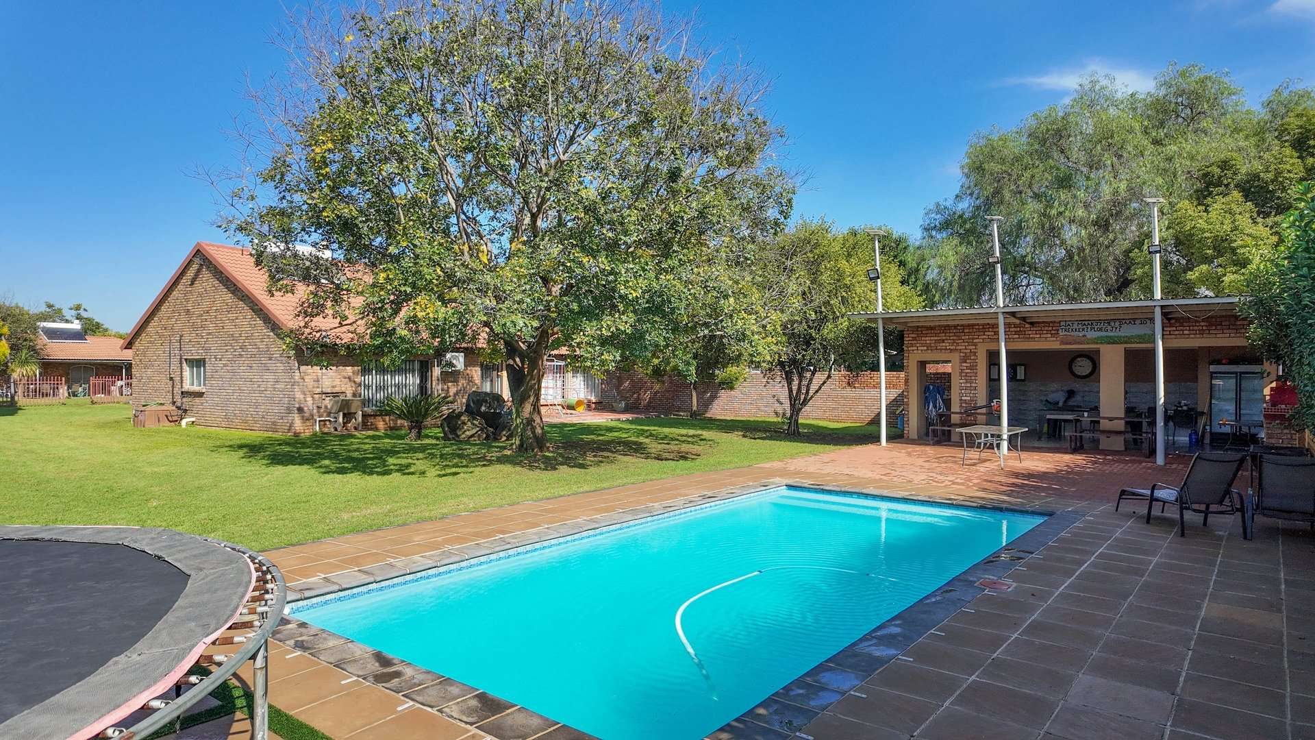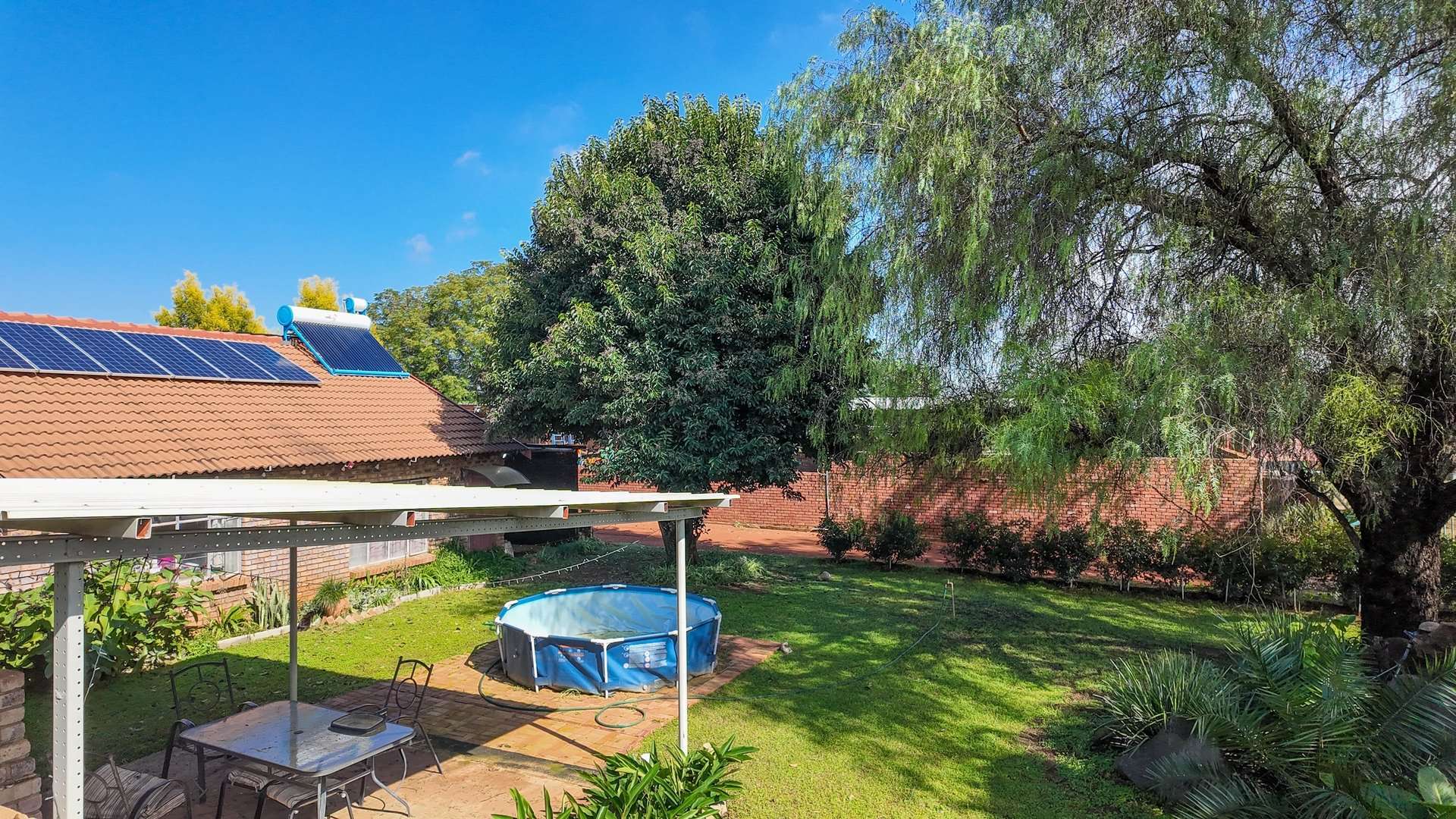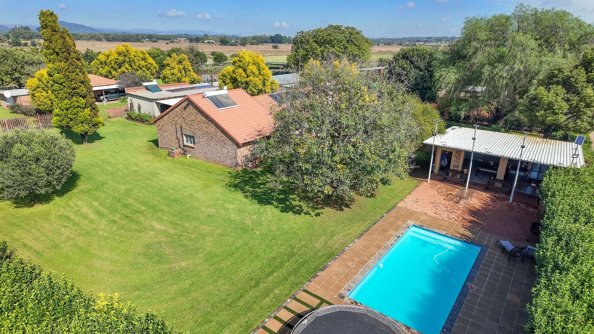 There are 5 solar geysers on the property as well as a solar power system for maximum electricity efficiency, a crystal-clear pool with an entertainment area next to it and a luscious garden with irrigation from the two boreholes that each deliver almost 8000 liters per hour.
