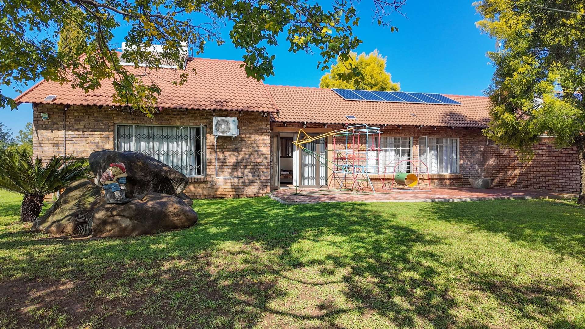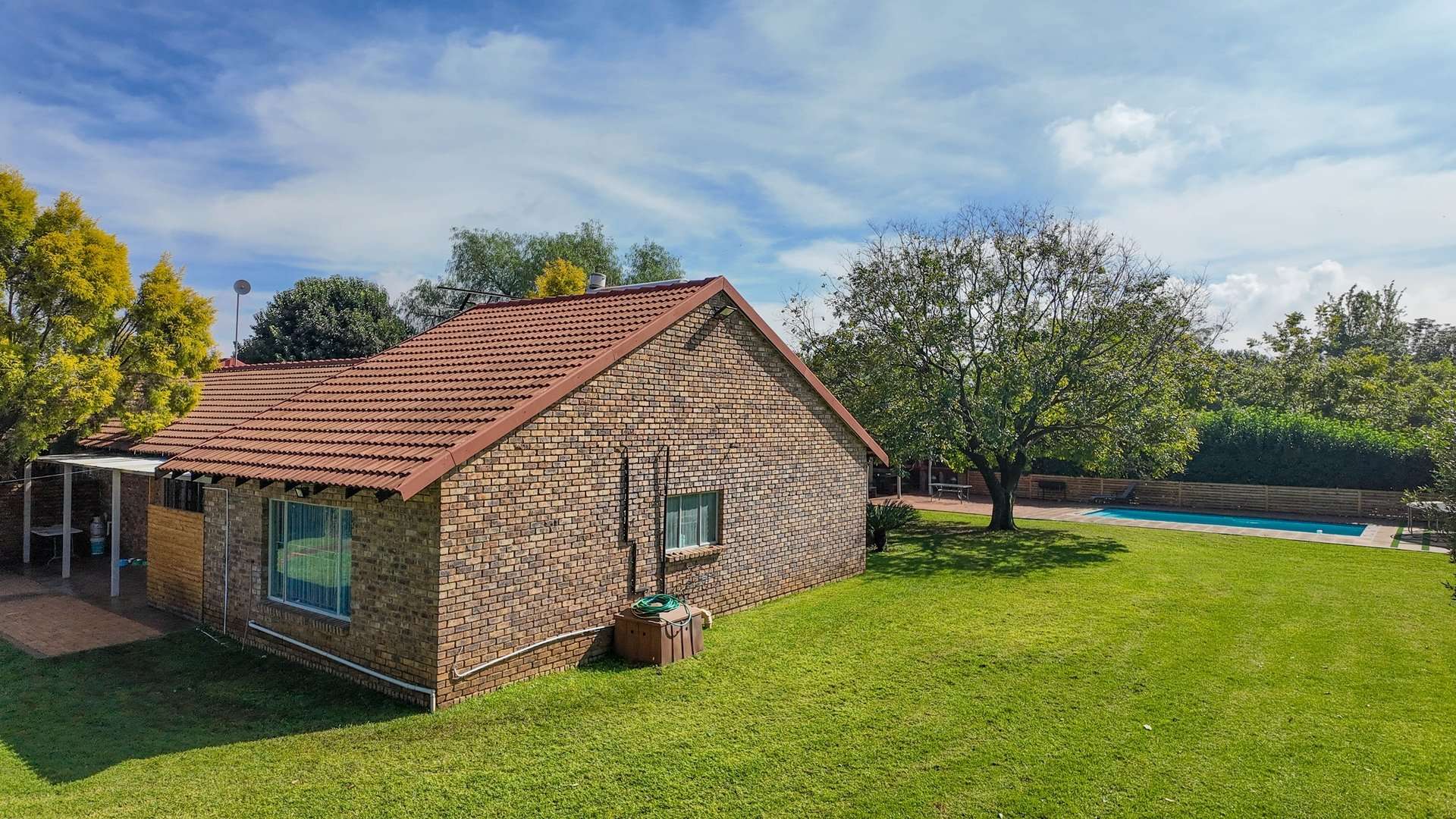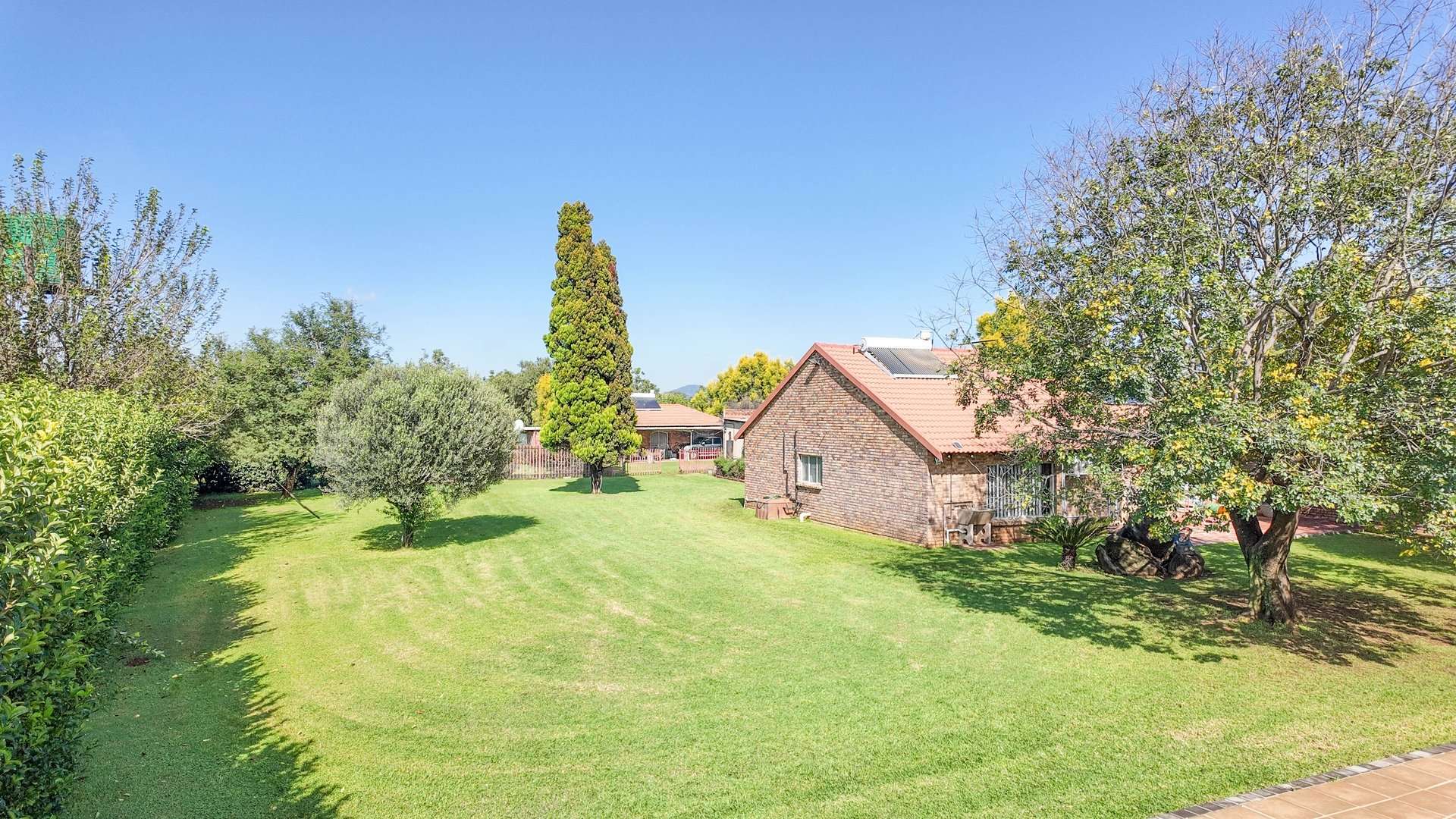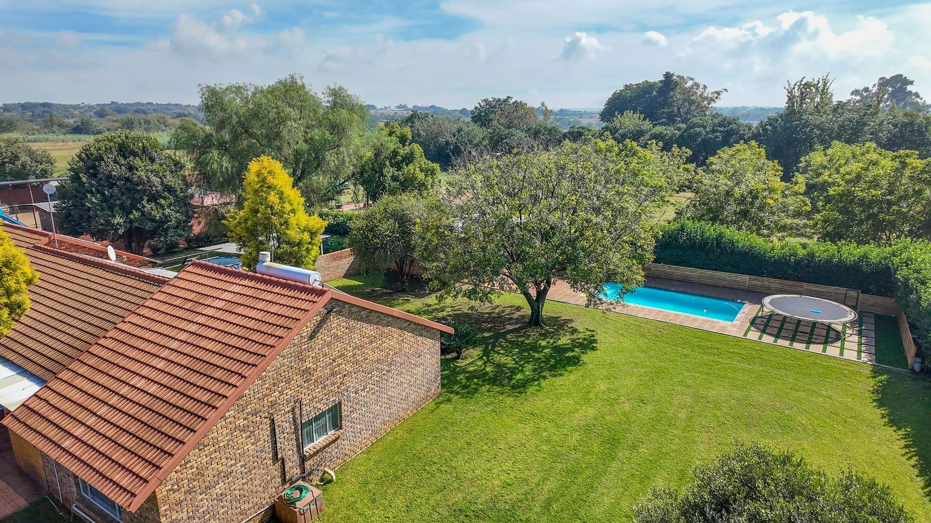 There are 5 solar geysers on the property as well as a solar power system for maximum electricity efficiency, a crystal-clear pool with an entertainment area next to it and a luscious garden with irrigation from the two boreholes that each deliver almost 8000 liters per hour.