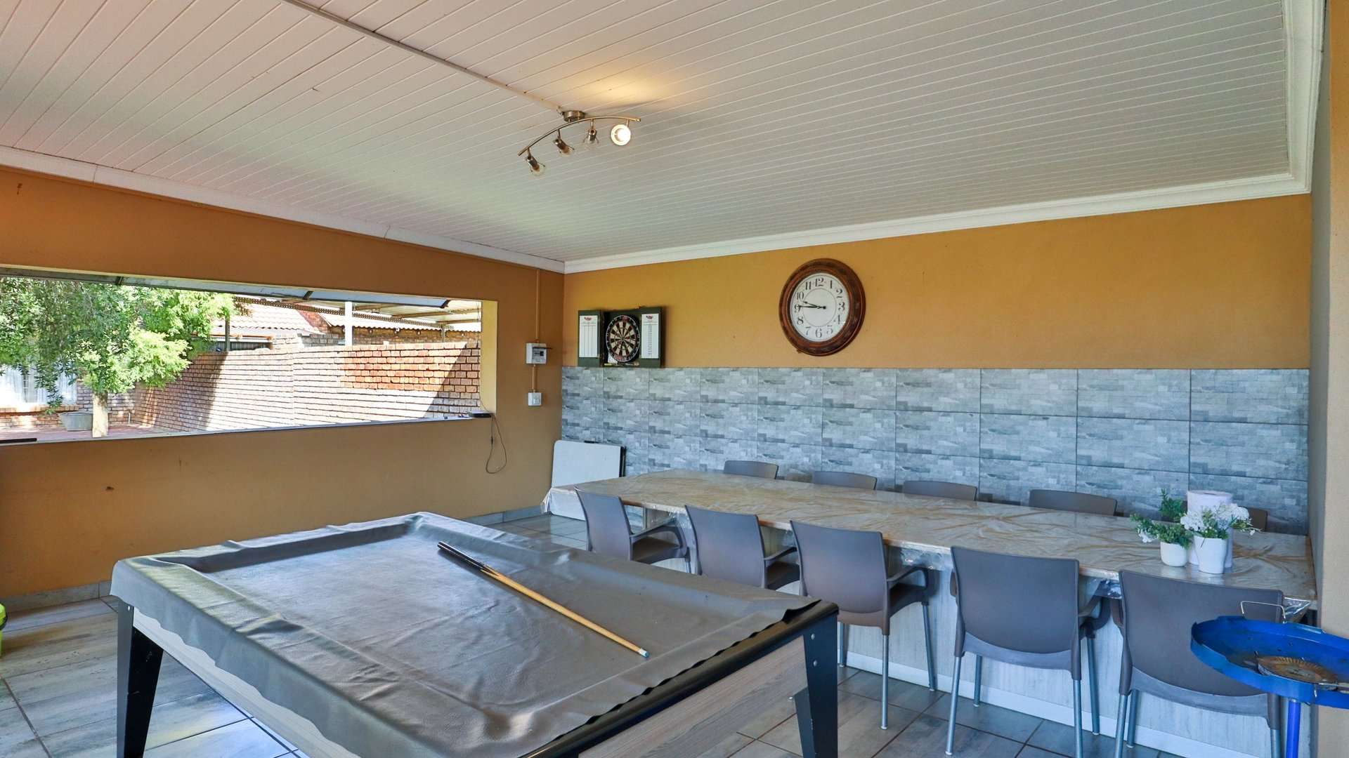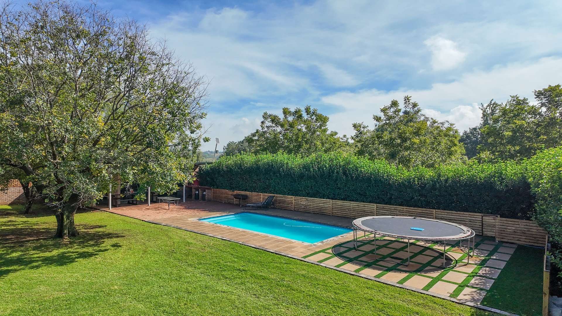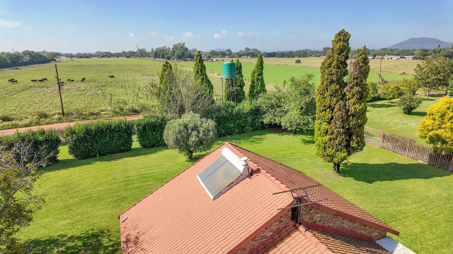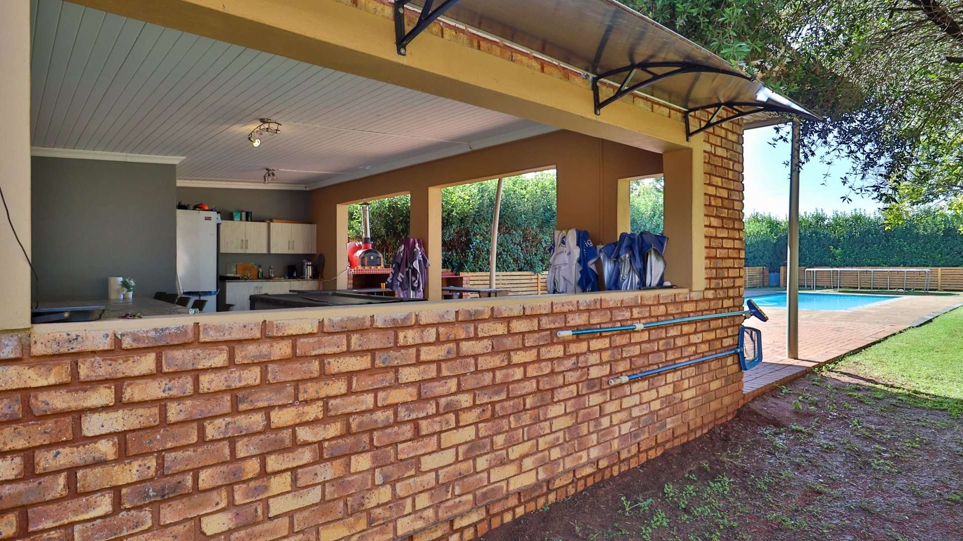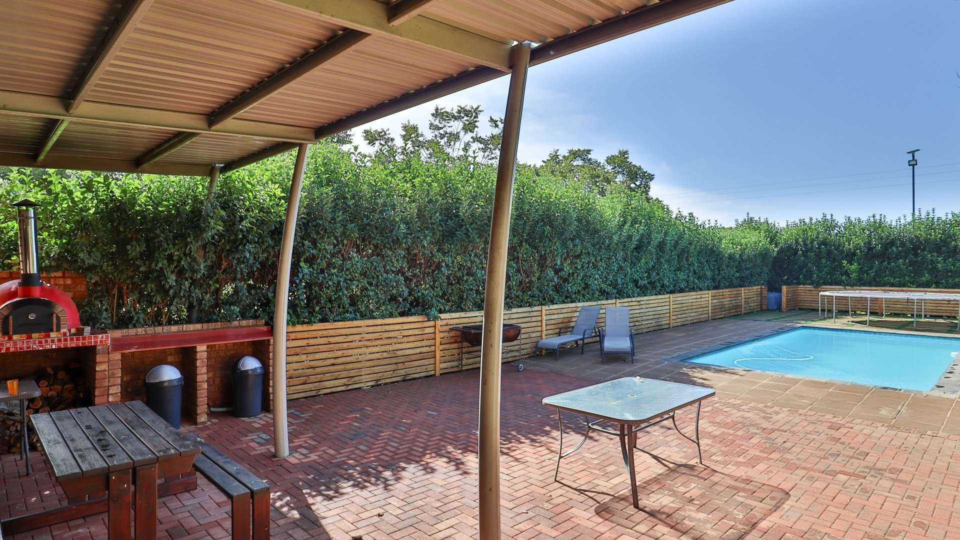 There are 5 solar geysers on the property as well as a solar power system for maximum electricity efficiency, a crystal-clear pool with an entertainment area next to it and a luscious garden with irrigation from the two boreholes that each deliver almost 8000 liters per hour.