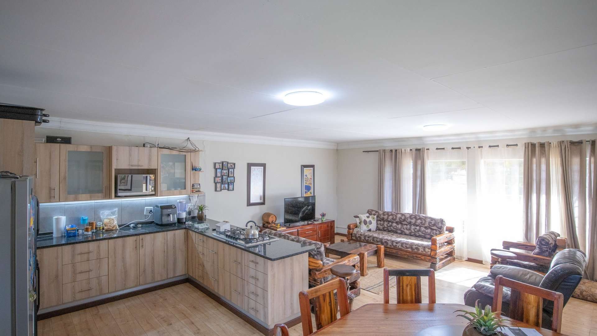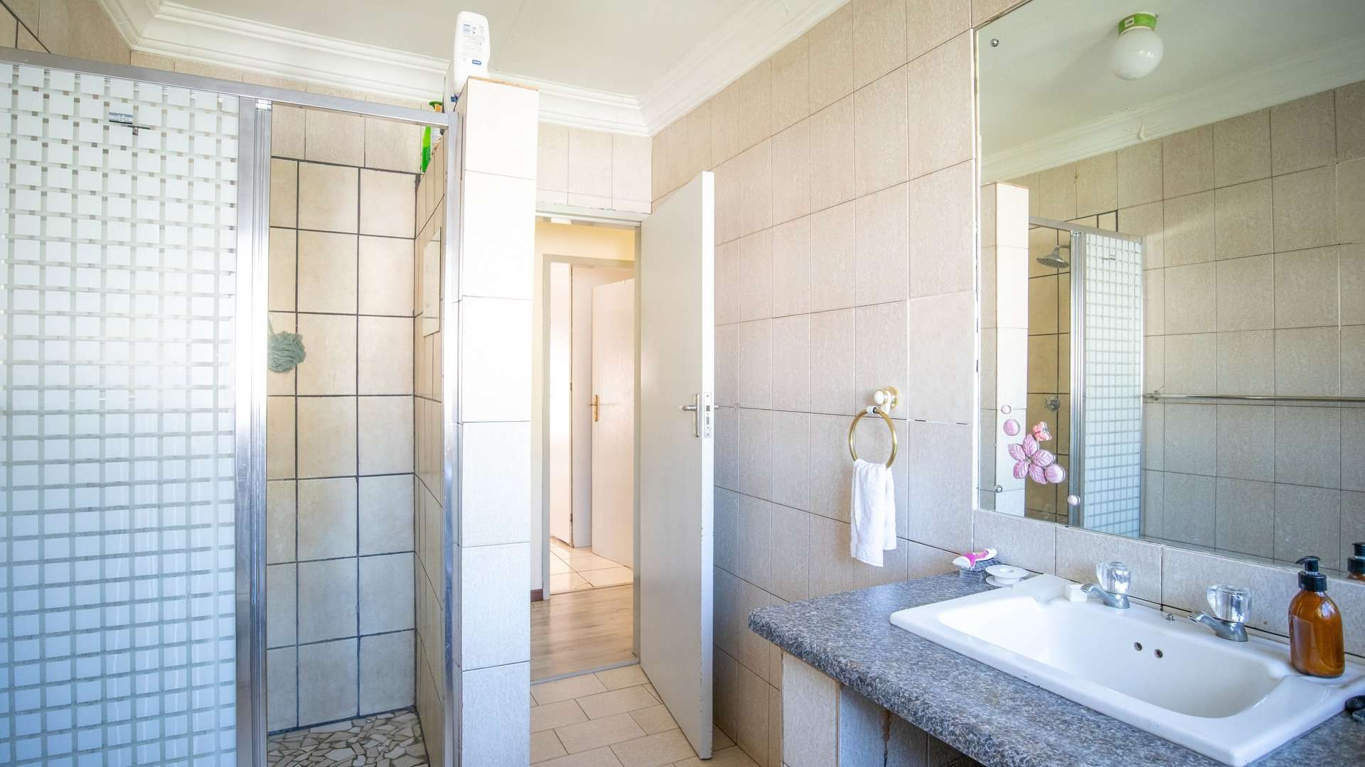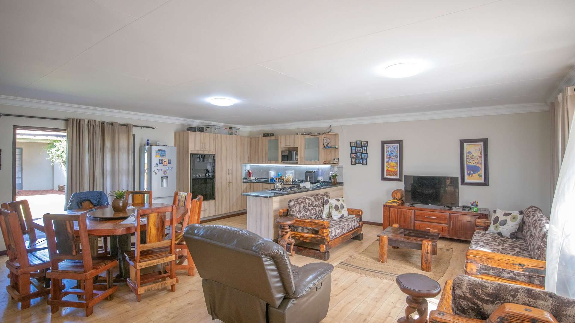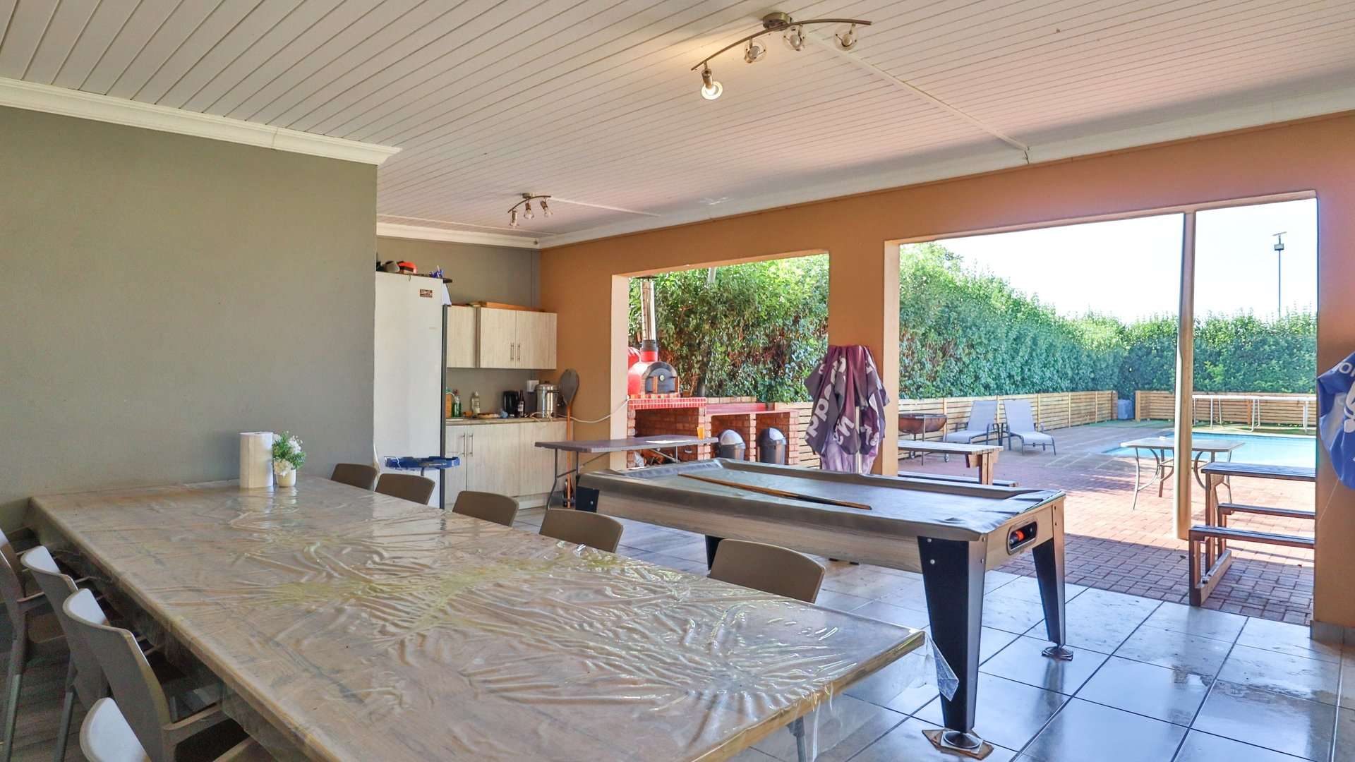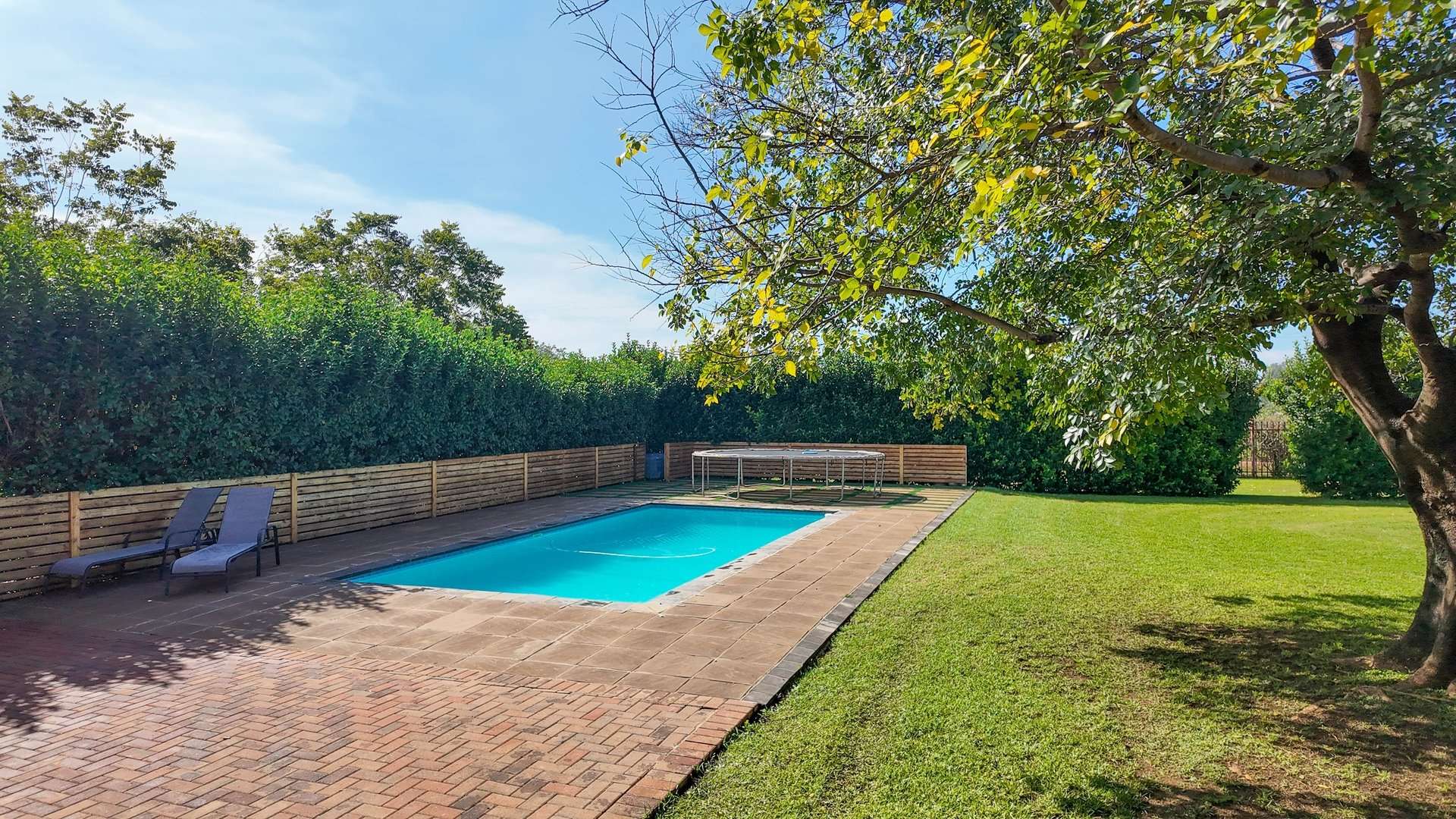 There are 5 solar geysers on the property as well as a solar power system for maximum electricity efficiency, a crystal-clear pool with an entertainment area next to it and a luscious garden with irrigation from the two boreholes that each deliver almost 8000 liters per hour.