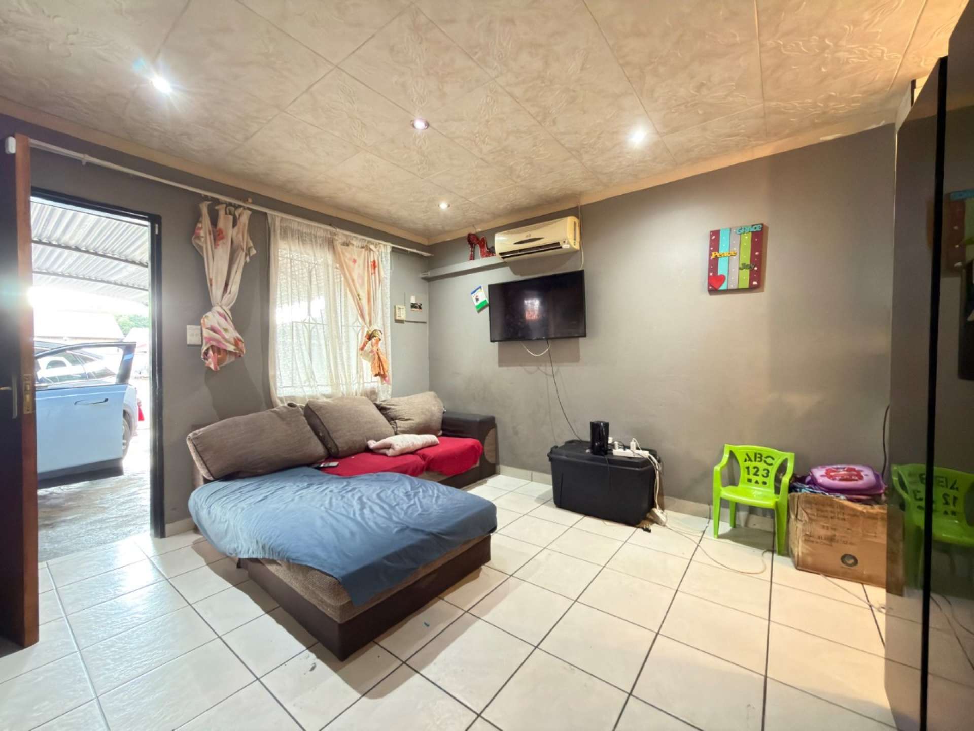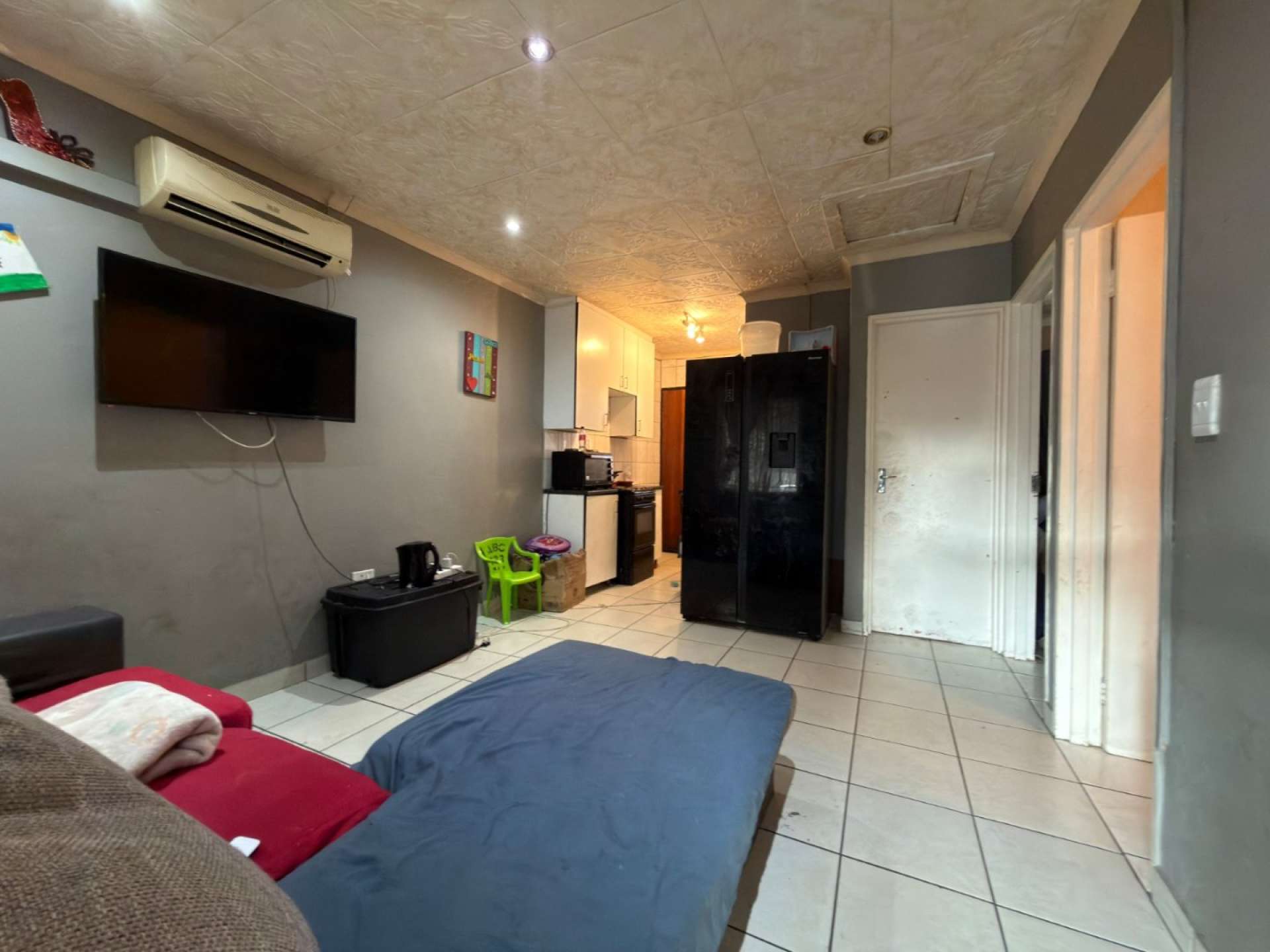 The home features a simple open-plan living area that connects the kitchen and lounge, creating a functional space for everyday living.