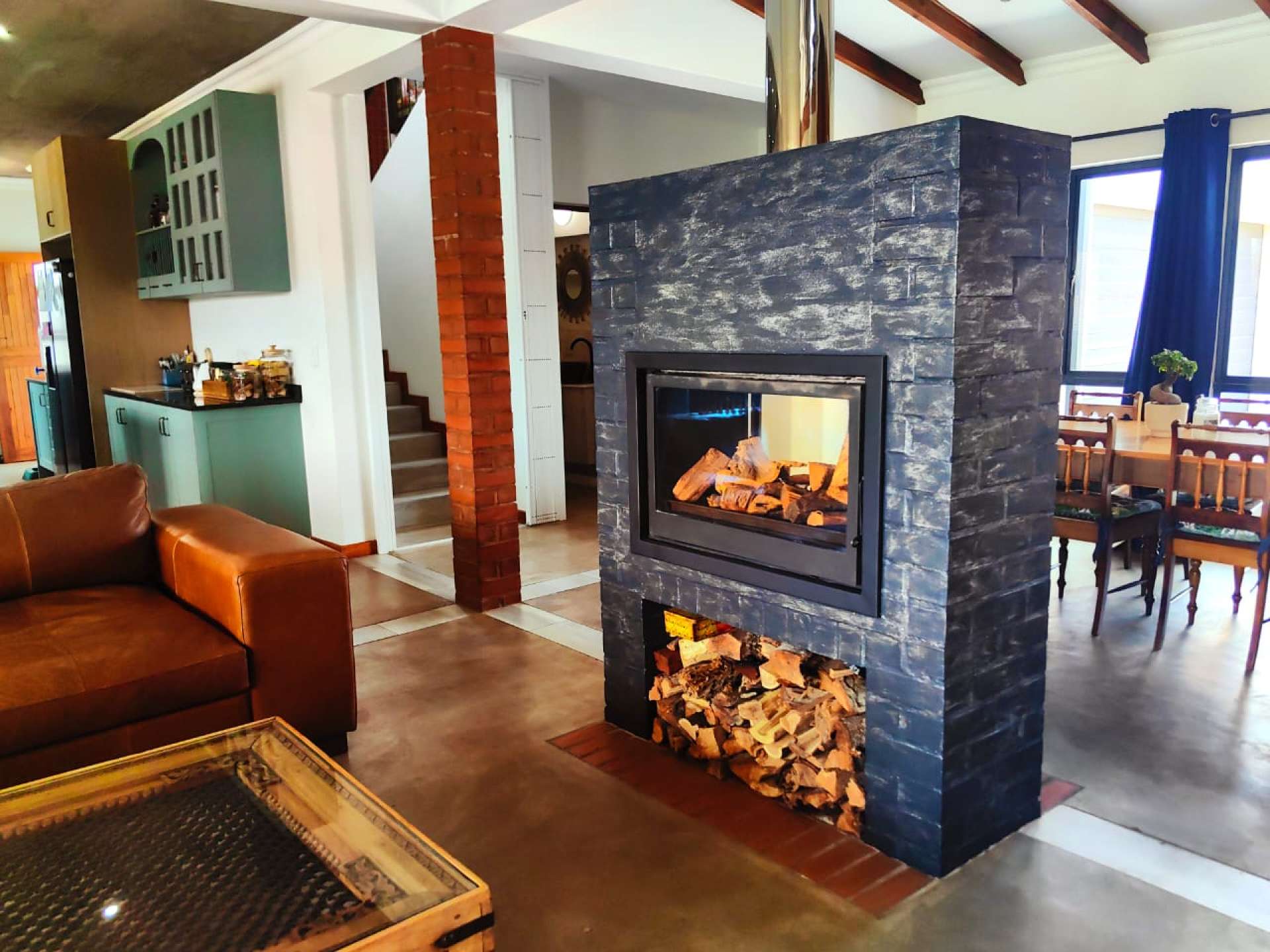Inside, the home boasts a contemporary kitchen with sleek built-in cupboards, a full stove and oven, scullery, and convenient linen storage. The open-plan dining and lounge area is enhanced by a double-sided fireplace, with sliding doors that seamlessly connect the living space to the patio and garden.
