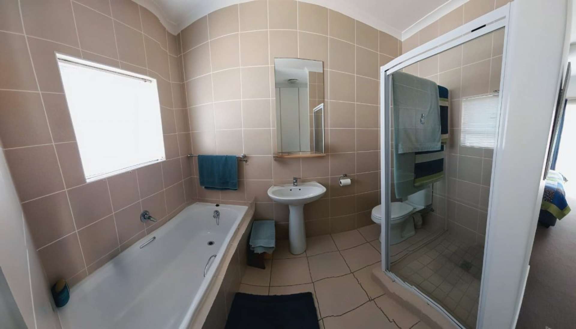 Accommodation includes three bedrooms with built-in cupboards. The main bedroom offers generous cupboard space, an en-suite bathroom, and a sliding door with direct access to the garden and patio. A second bathroom services the remaining bedrooms.