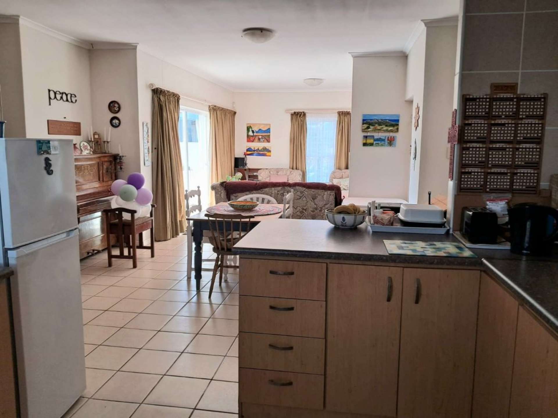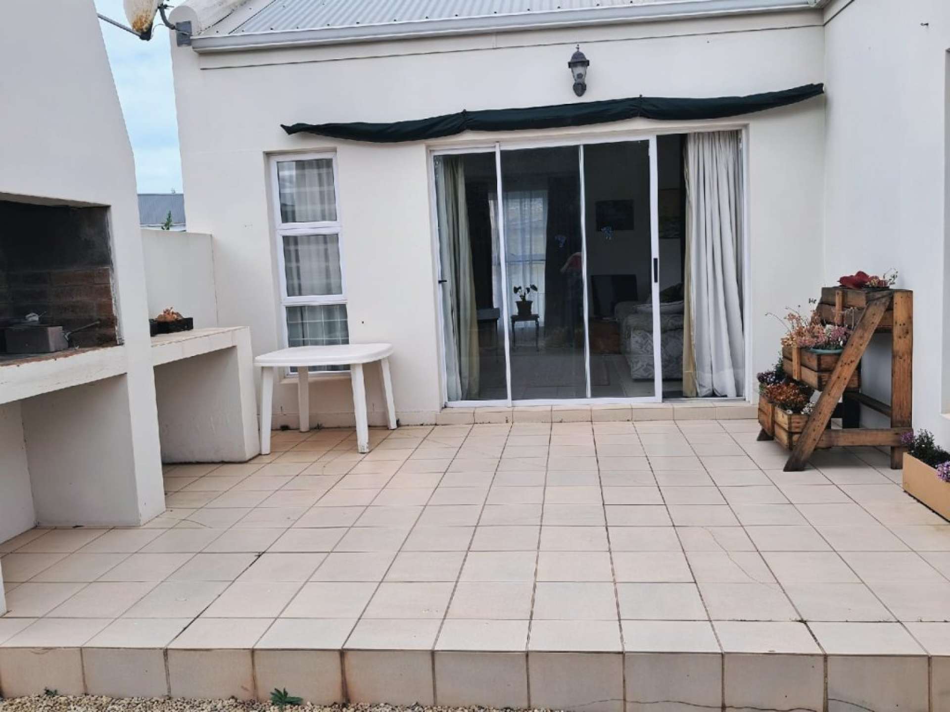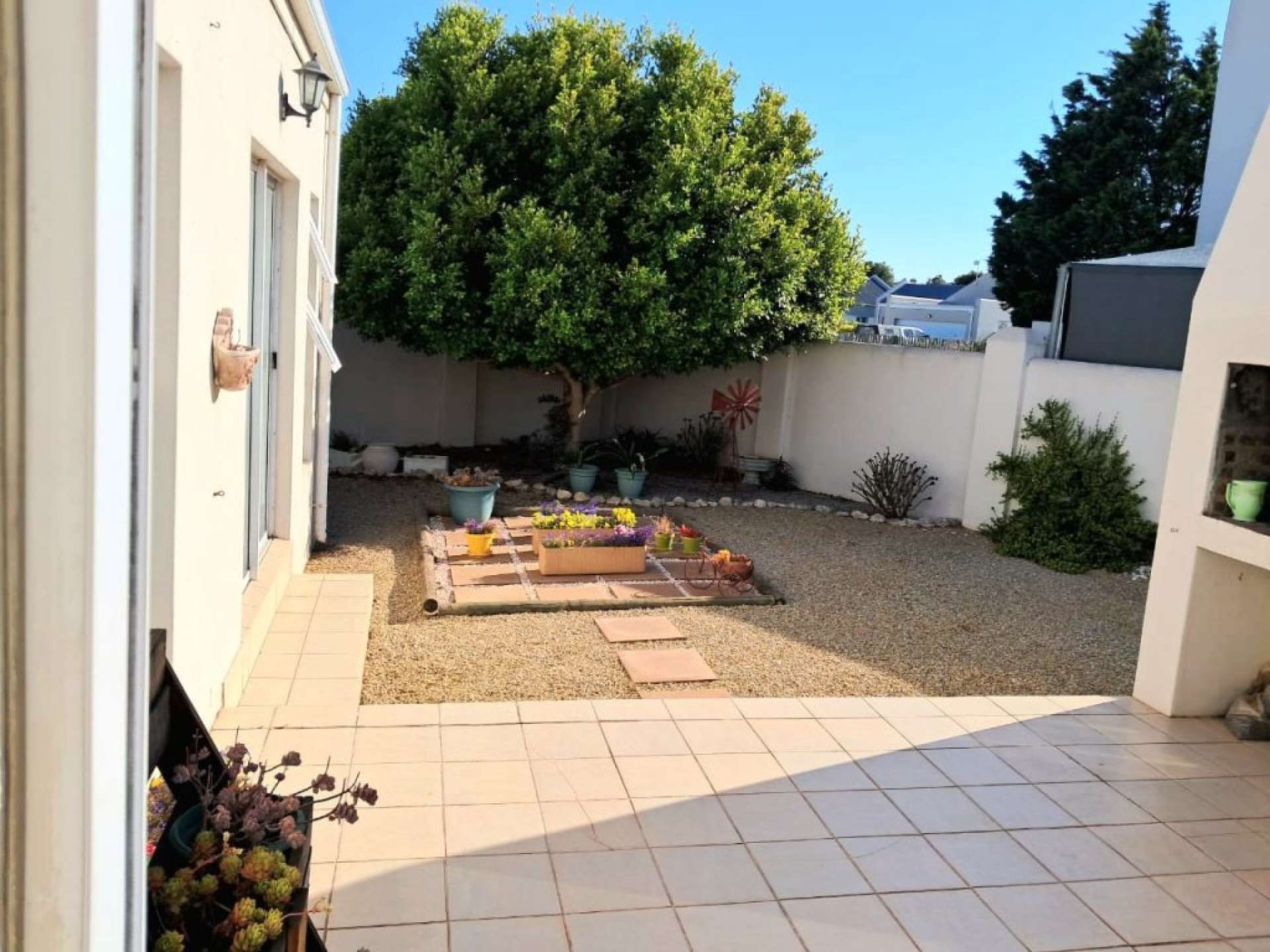 The home features a bright, open-plan living and dining area that flows effortlessly onto a north-facing braai and patio area, creating an inviting space for entertaining and relaxed family living. A neat garden with a fruit tree adds to the tranquil atmosphere.