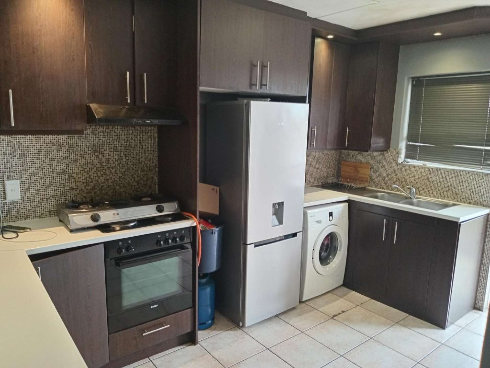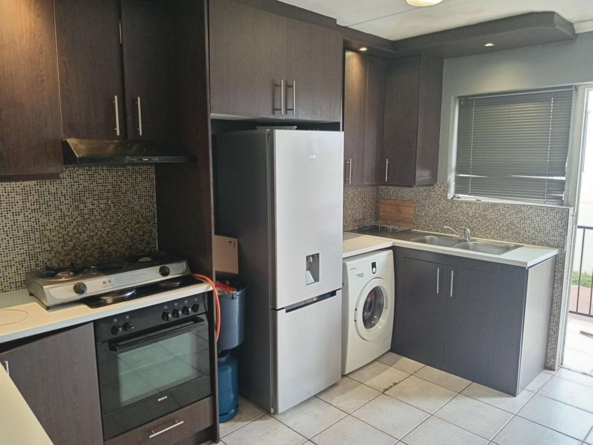 * Kitchen with built-in oven and stove and space for a washing machine