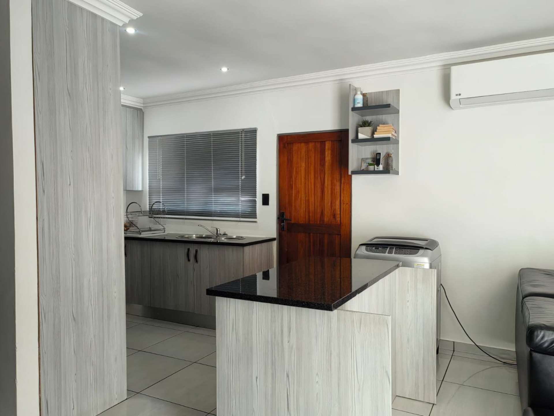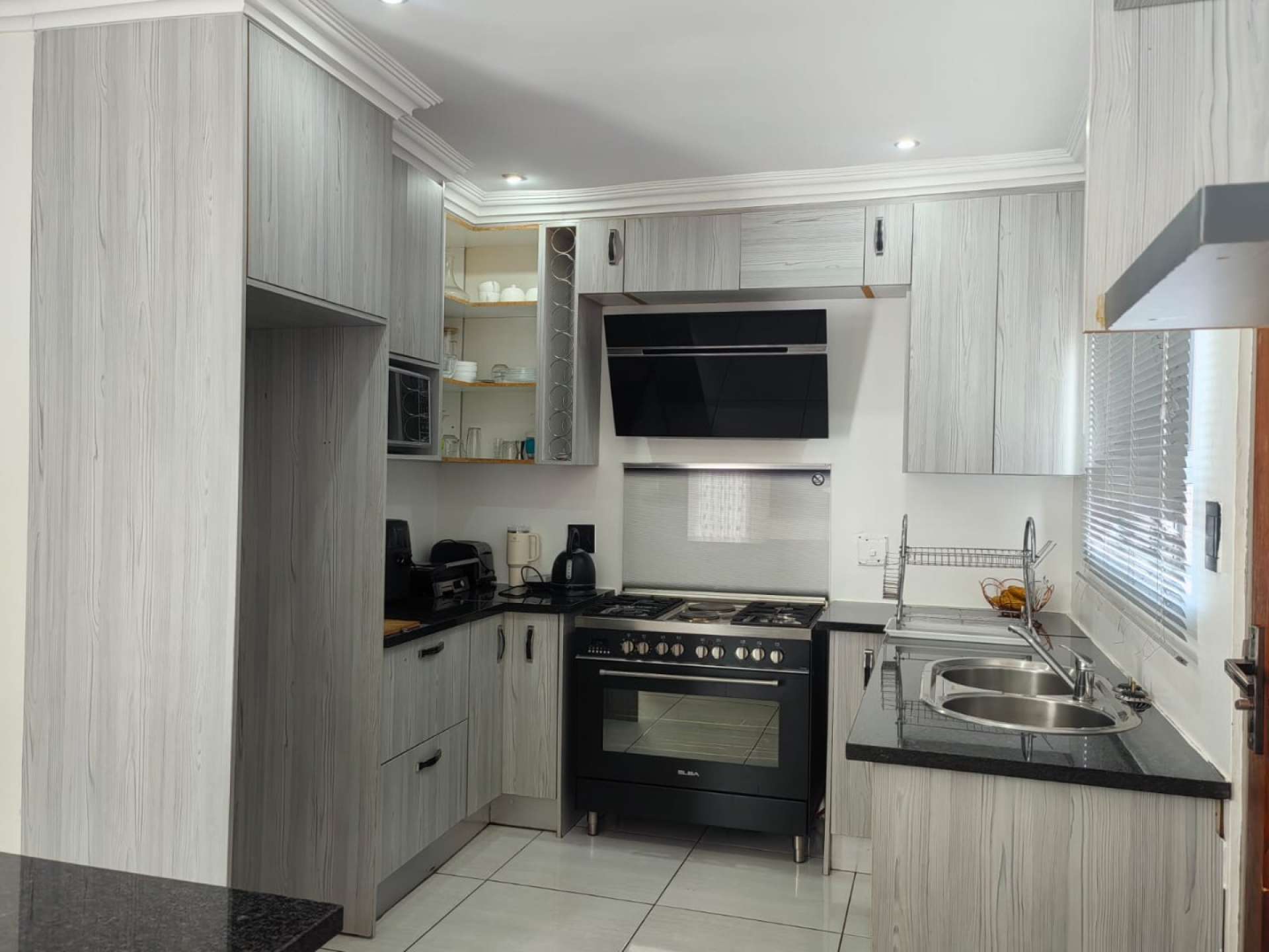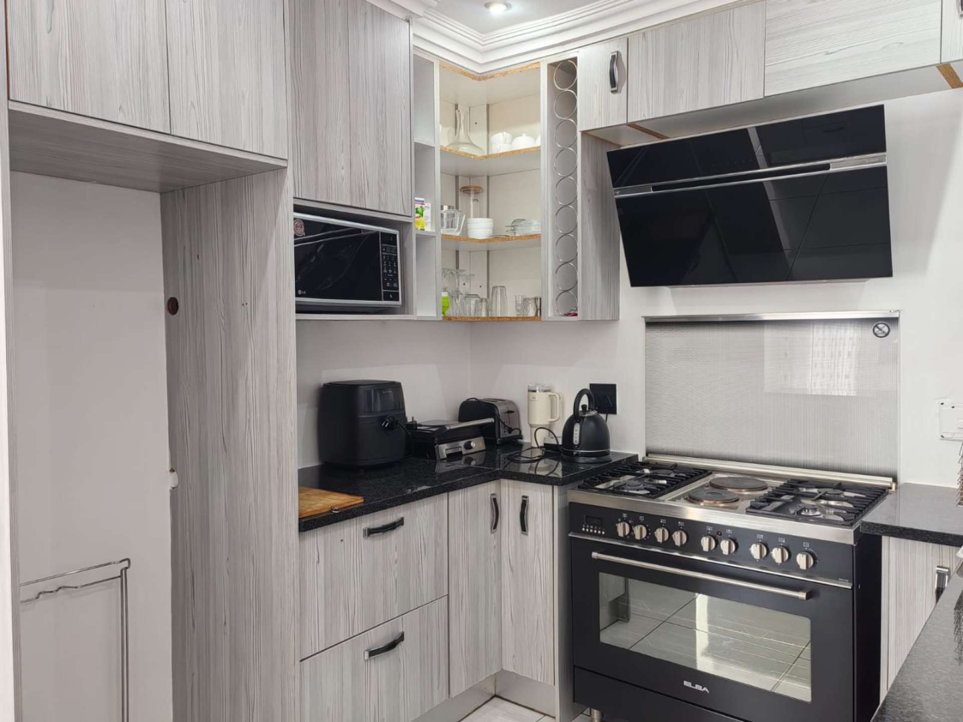 * Open plan kitchen with enough storage and gas stove