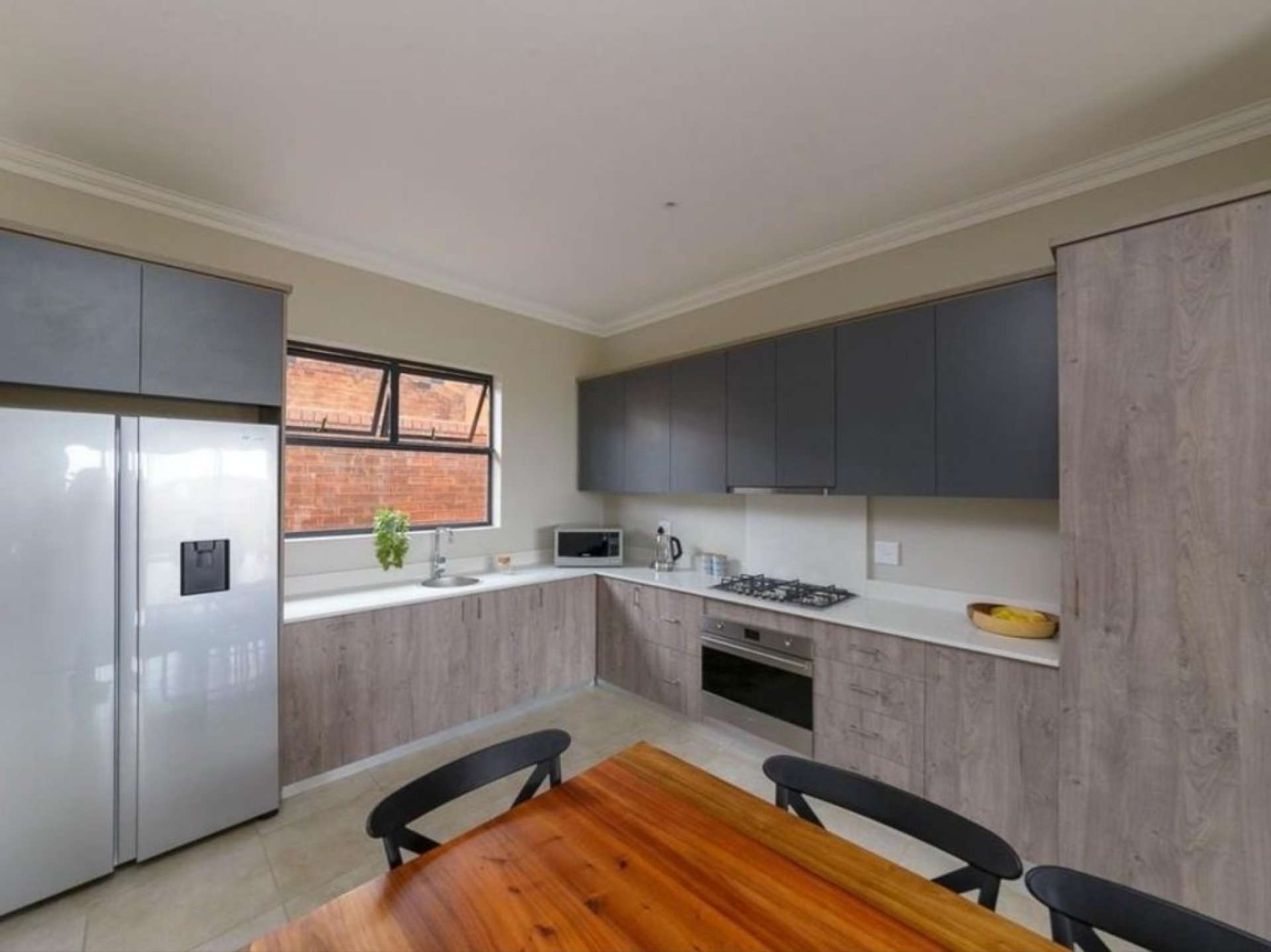 - An open-plan kitchen with ample cupboard space, elegant granite countertops, a Smeg gas hob, Smeg electric oven, separate scullery, and a convenient pantry.