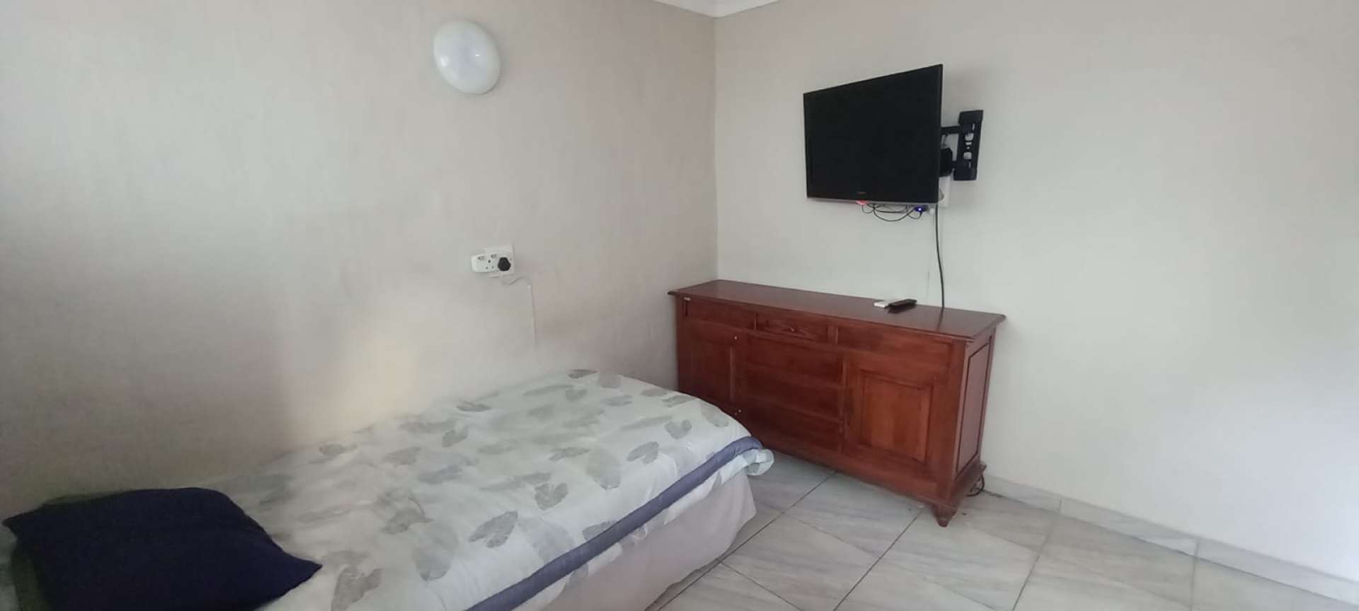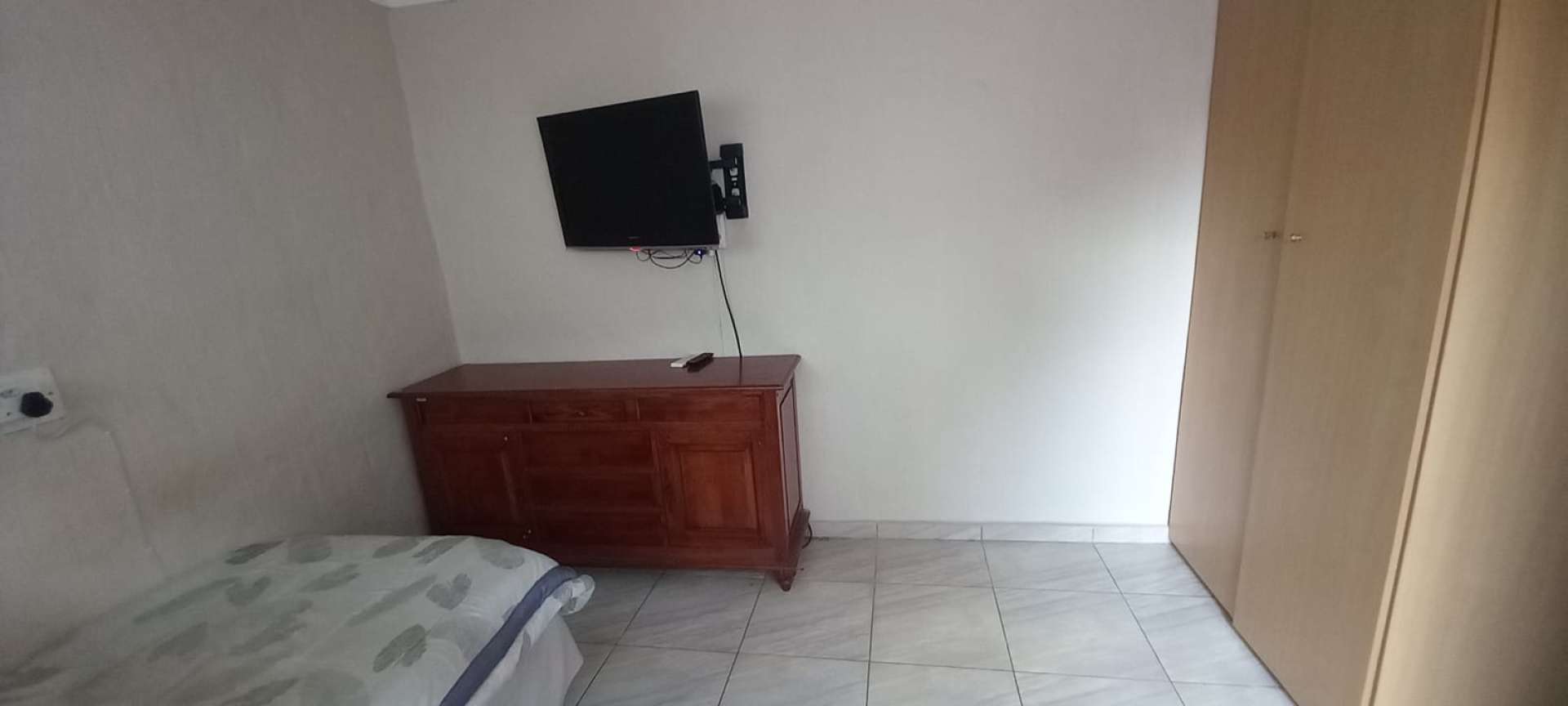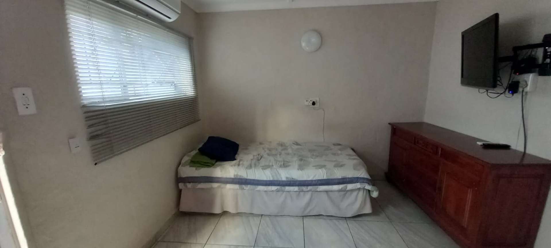 Bedroom furnished with a single bed, television, built-in cupboards, and air conditioner.