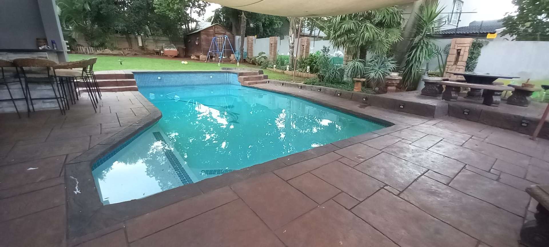 Enjoy safety and security with an alarm system, and up garage with a sparkling pool set in lovely entertainment area in a beautiful garden.