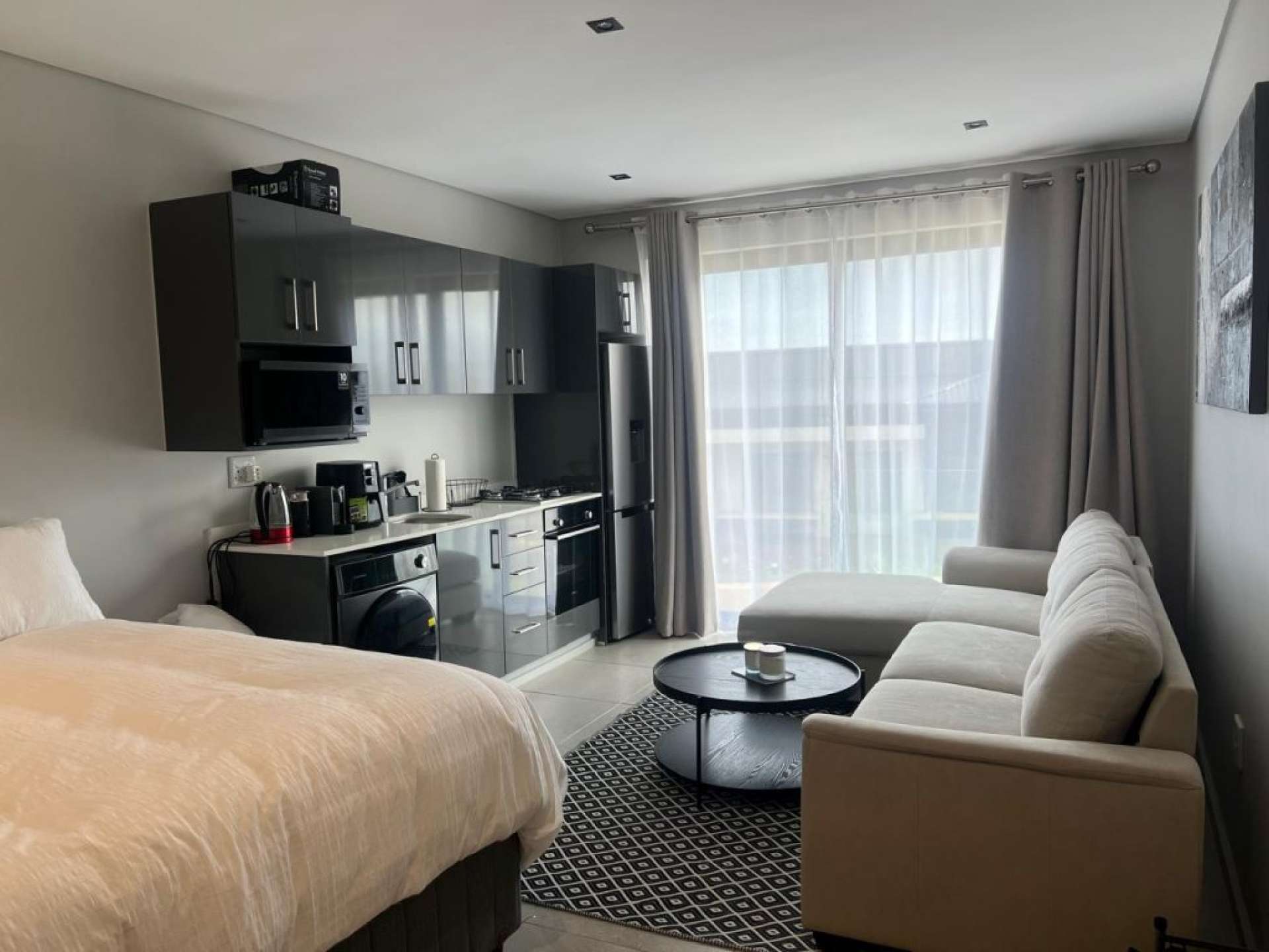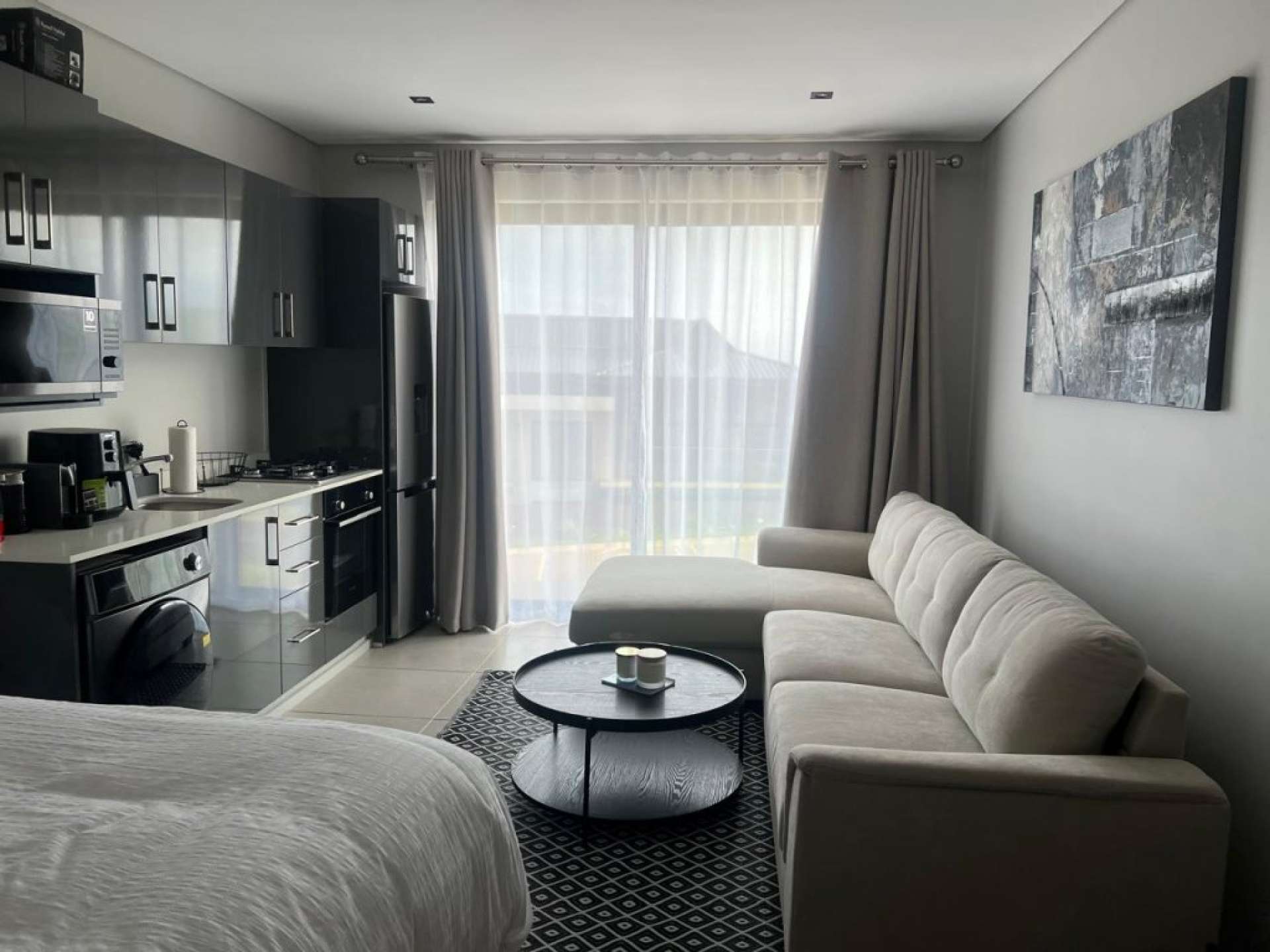 Compact meets contemporary in this beautifully designed bachelor studio, nestled in the vibrant and growing neighborhood of Zimbali. The open-plan layout features a modern kitchen with grey finishes, clean architectural lines, and clever use of space—ideal for those who love minimalist living with maximum style.