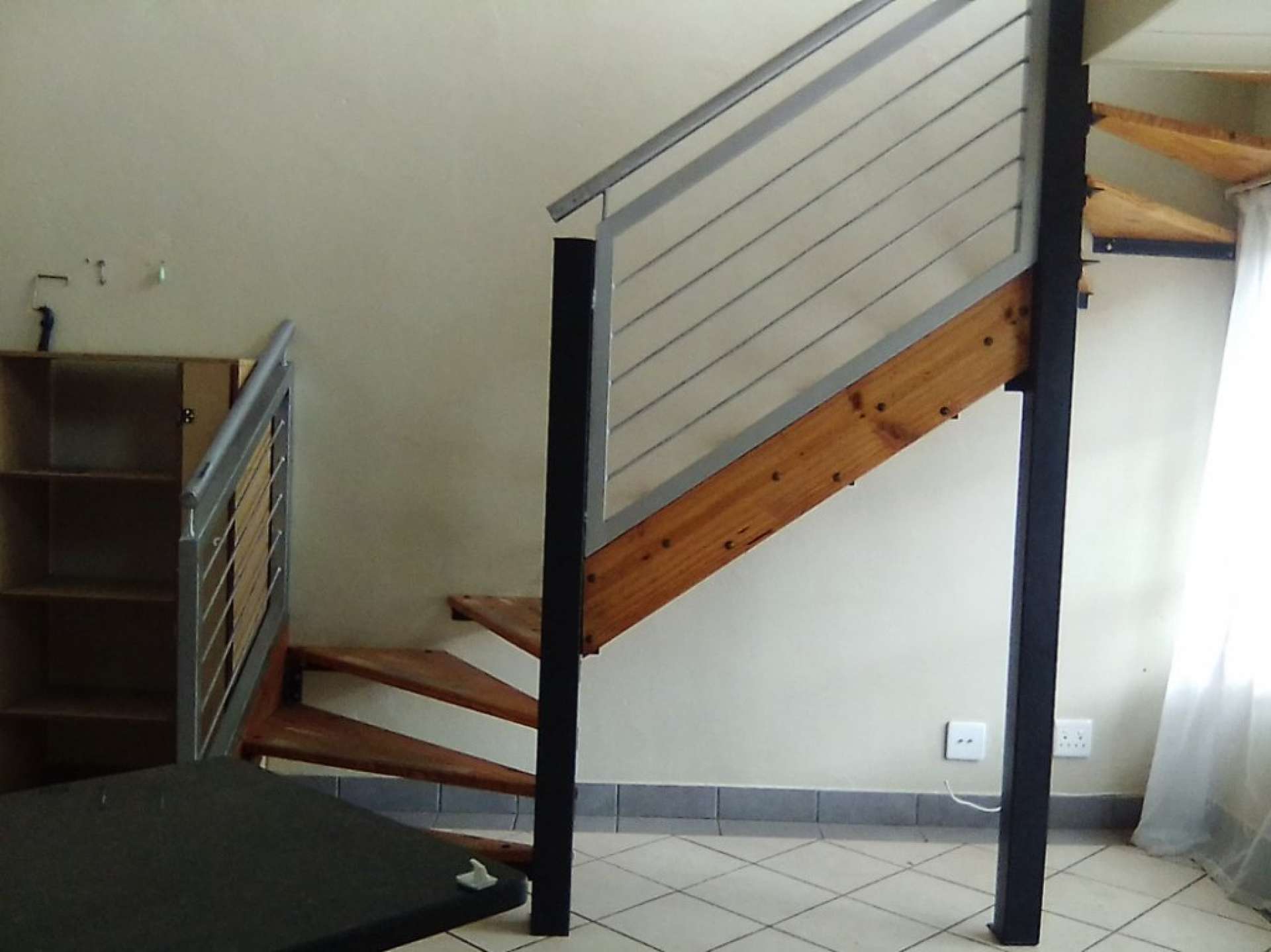 Charming wooden stairs lead to a spacious loft with wooden flooring, offering flexibility to use the space as a second bedroom, study, or additional living area. The main bedroom includes built-in cupboards and a cozy study nook, while the bathroom is fitted with a bath, toilet, and basin.